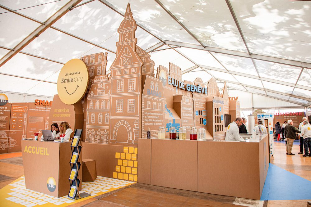 En Cartonlab contamos con diversos ejemplos que se asemejan a la exposición montada en Ginebra. En la edición de 2018 de URBACT, en Lisboa, nos encargamos de todo el diseño y la producción del espacio de este encuentro internacional que versa sobre el adecuado crecimiento de las ciudades. Dentro de los trabajos realizados para el Instituto de Comercio Exterior de España, ICEX, podemos mencionar nuestra presencia en la feria Smart City de Barcelona, dedicada a los retos por cumplir de las ciudades en materia de sostenibilidad.