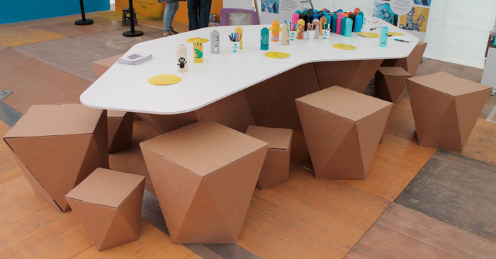Para amueblar el espacio, combinamos piezas hechas a medida con otras más habituales en nuestros trabajos. Por ejemplo, una variación de nuestro mostrador Faceta, varios taburetes de la misma familia, en tamaño adulto e infantil. La mesa de la zona de street art se diseñó para la ocasión, con una capa exterior, producida en un fino cartón de 3’6 mm de grosor que facilita sus pliegues geométricos. La reforzamos en su parte superior con un tablero de madera fenólica con acabado blanco y canteado.