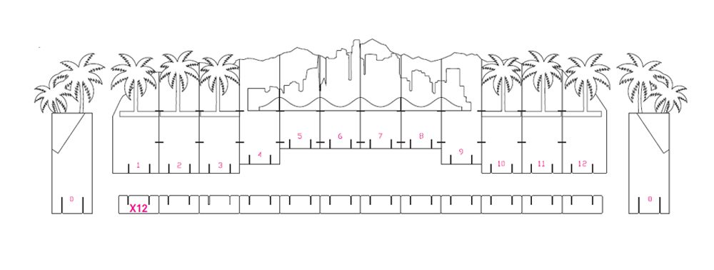 - Biombo troquelado con olas, palmeras y un skyline de Los Ángeles impreso.