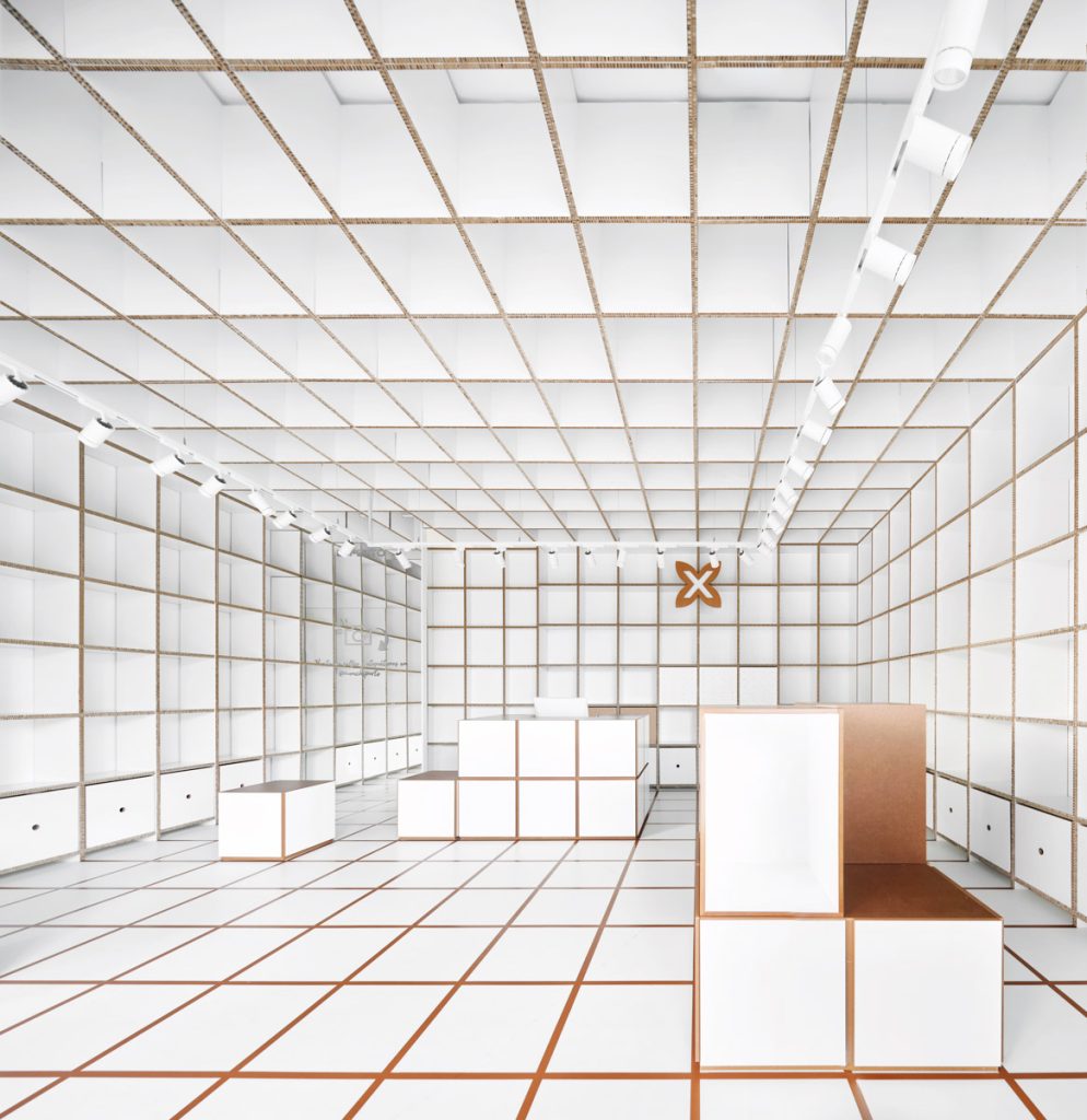 Siguiendo la línea de otros proyectos de retail diseñados junto a Studio Animal. Toda la tienda está construida con materiales 100% reciclables, en esta ocasión cartón nido de abeja. Uno de los proyectos más representativos que hemos diseñado juntos es la tienda para NUHU, que ha obtenido gran difusión y un amplio reconocimiento internacional.