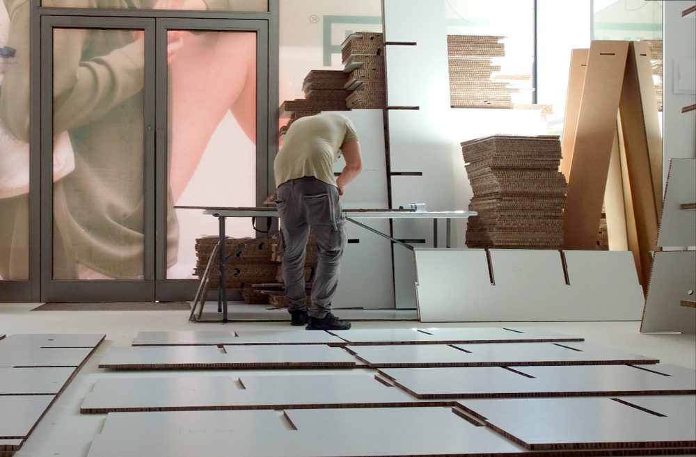 Trabajar con un material ligero como el cartón permitió construir grandes paños de estantería sobre el suelo, que luego se levantaban de una pieza para colocar sobre las paredes y techo. La instalación se llevó a cabo por un equipo de 4 personas, durante el horario habitual de apertura del centro comercial, sin provocar ruidos ni molestias a los clientes del resto de establecimientos.
