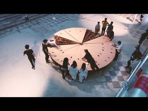 Las 230 piezas de cartón necesarias para el montaje se distribuyeron en paquetes planos apilados, ahorrando volumen de transporte. Para el montaje contamos con la colaboración de varios grupos de estudiantes convocados por The Academy. Toda la instalación se realizó sin incidentes en menos de una jornada de trabajo.