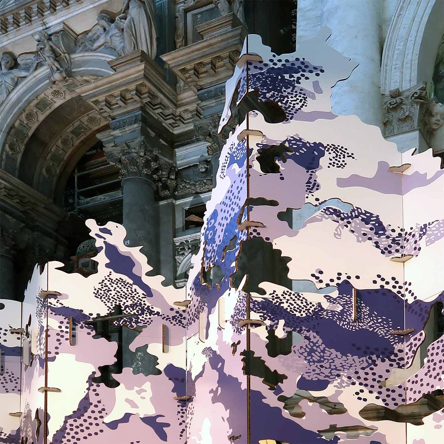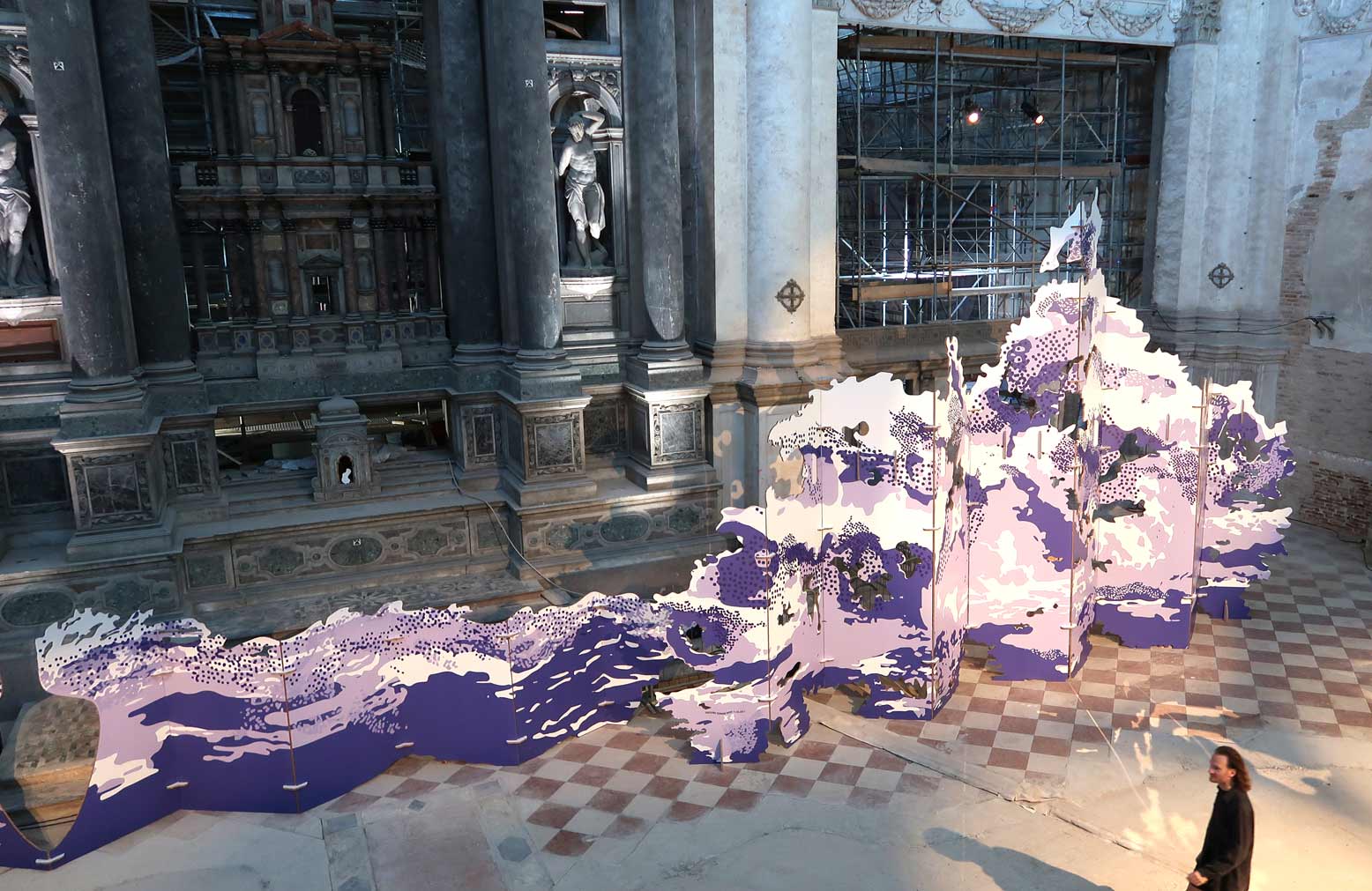 Para ello se diseñaron 2 elementos en formato de biombo, con una longitud total de 25 metros y una altura en el punto más alto cercana a los 6 metros. El panel de mayor envergadura representa el gran tsunami de Fukushima y el más alargado corresponde a la estela del barco Caribbean Princess Cruise Ship, responsable de vertidos contaminantes incontrolados al mar.