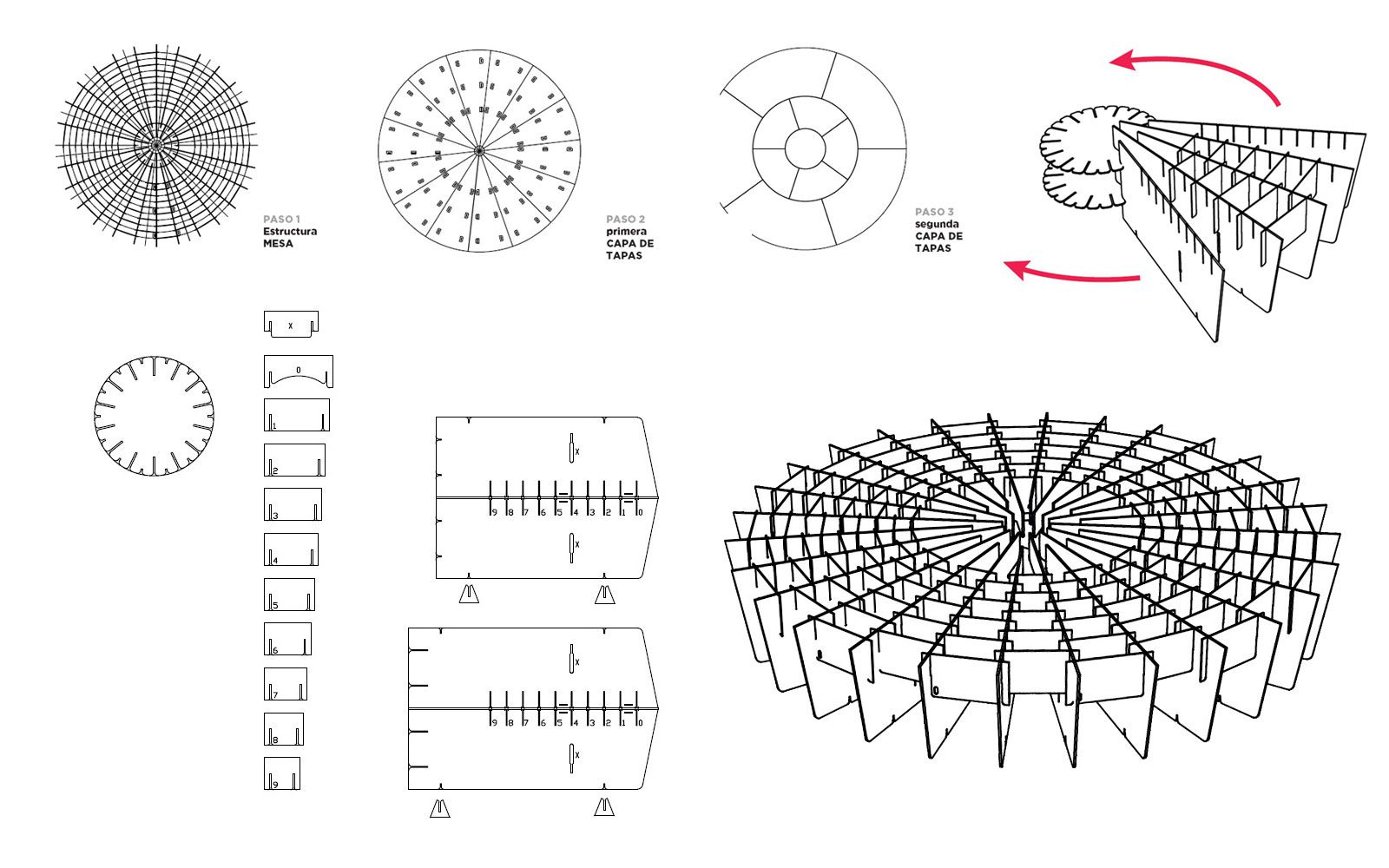 Para garantizar la resistencia necesaria diseñamos una estructura modular formada por 28 costillas de cartón EB dispuestas de forma radial. Sobre cada una de ellas se encajan otras 10 piezas de menor tamaño que aportan estabilidad y solidez todo el conjunto. Finalmente se coloca la superficie del tablero de la mesa, formada por 2 capas de cartón y un acabado superficial de PVC de 5mm impreso digitalmente.