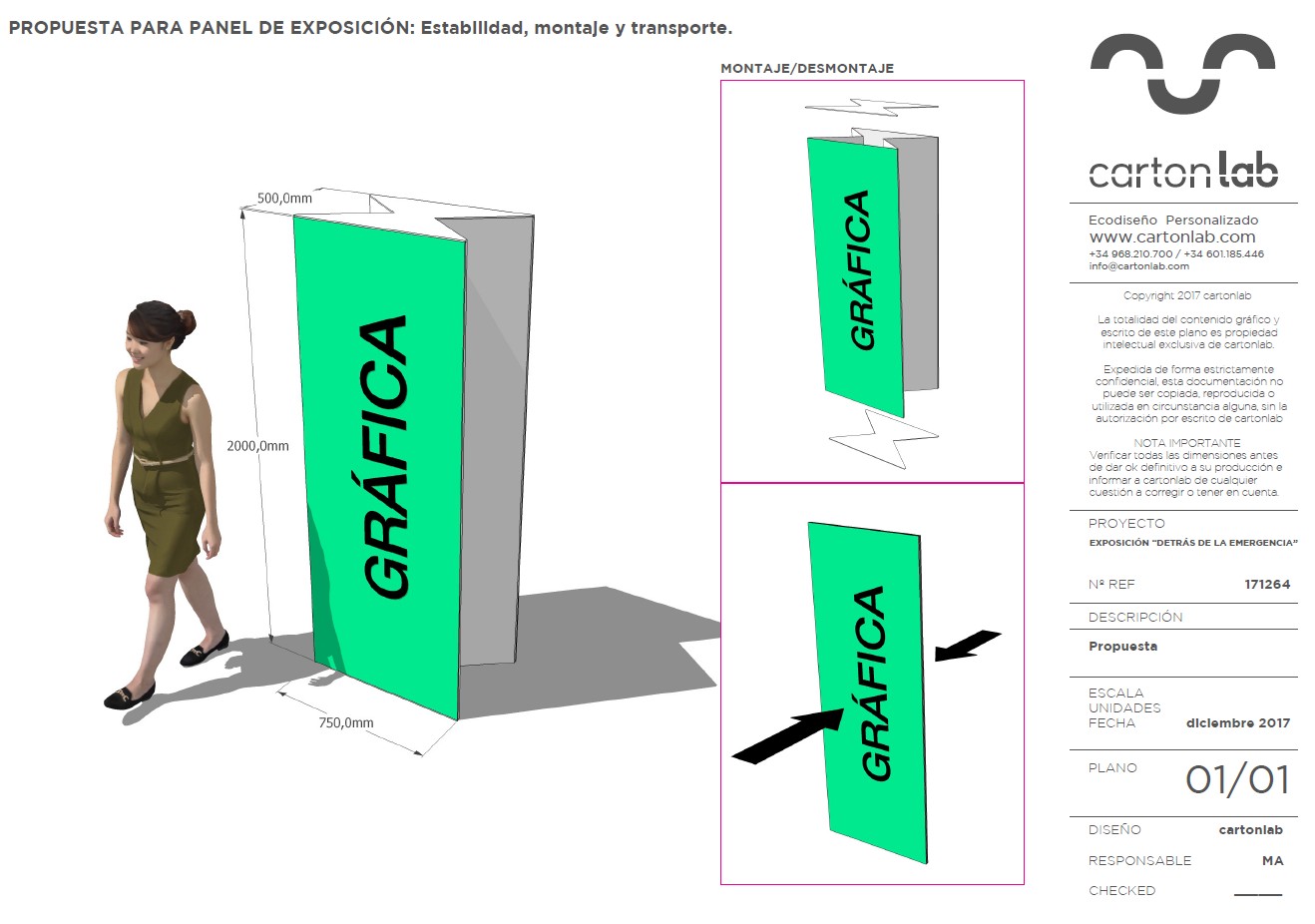 El montaje, transporte y almacenaje de la exposición se realizó de forma muy ágil al estar compuesta de paneles de cartón ondulado ligeros y desmontables. La creación de los tótems expositivos tuvo un elaborado proceso previo en nuestro taller, donde se testearon diversos prototipos hasta dar con el definitivo.