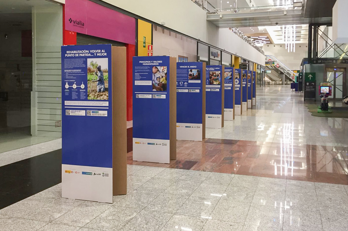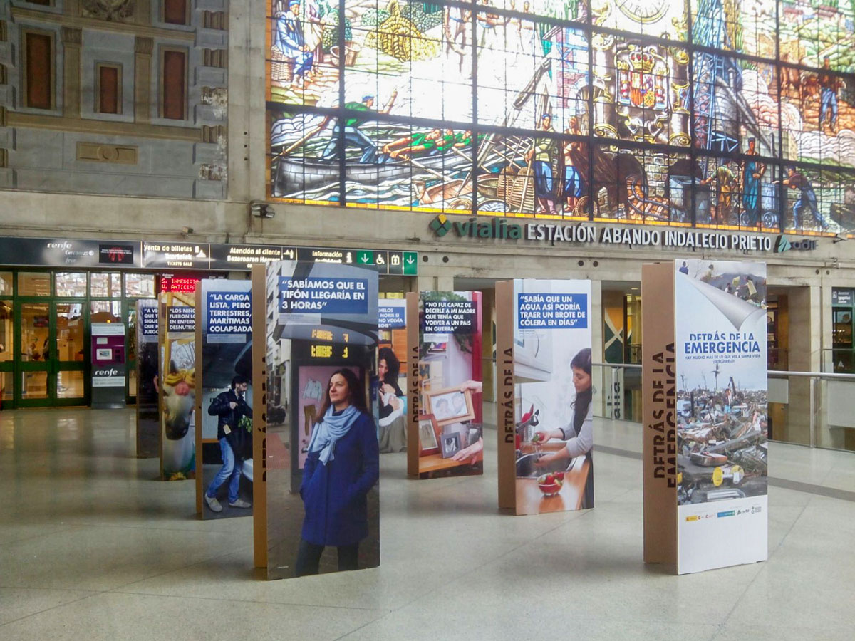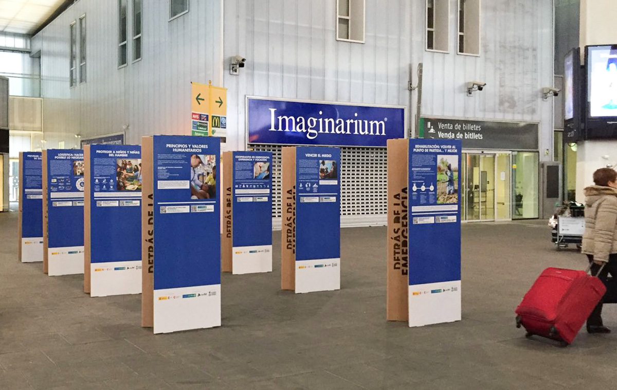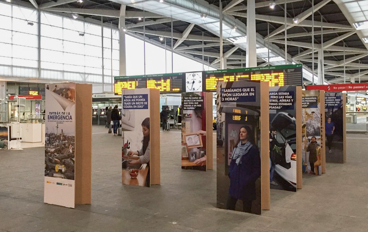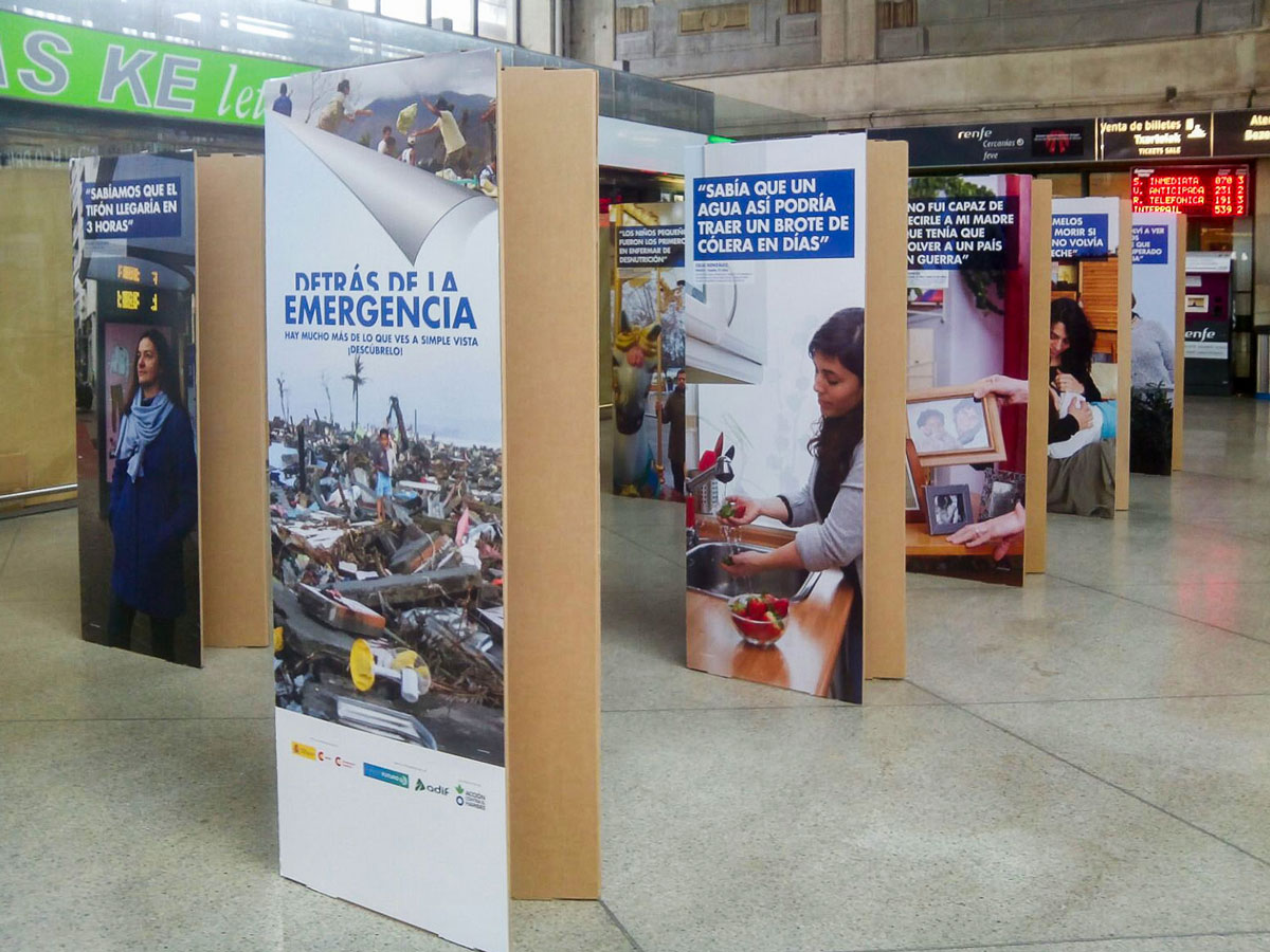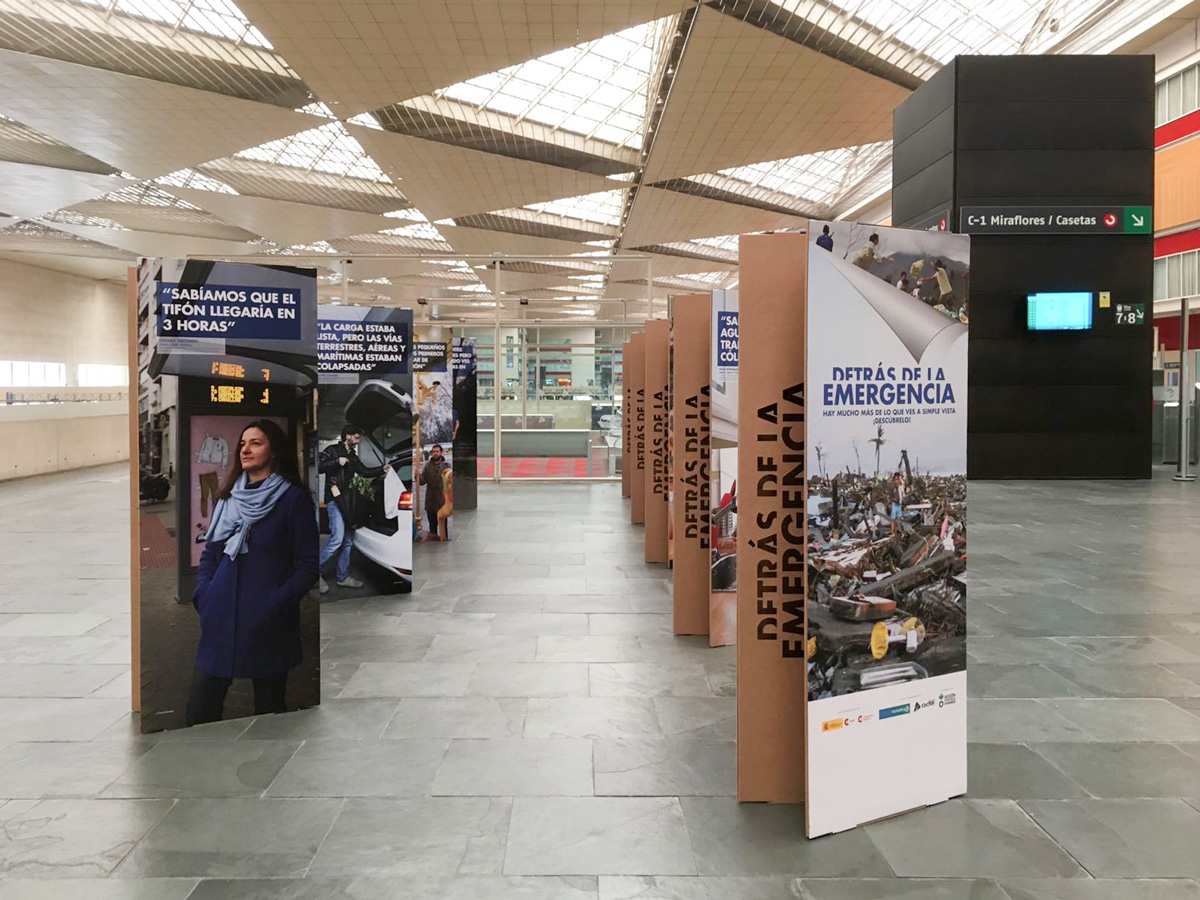 La exposición itinerante ‘Detrás de la emergencia‘ fue una muestra promovida por Acción contra el Hambre y la Cooperación Española con el apoyo de Adif y Planeta Futuro. Pretendía visibilizar las dificultades que implica una intervención de emergencia a todos los niveles: logística, seguridad, estrés psicológico y coordinación.