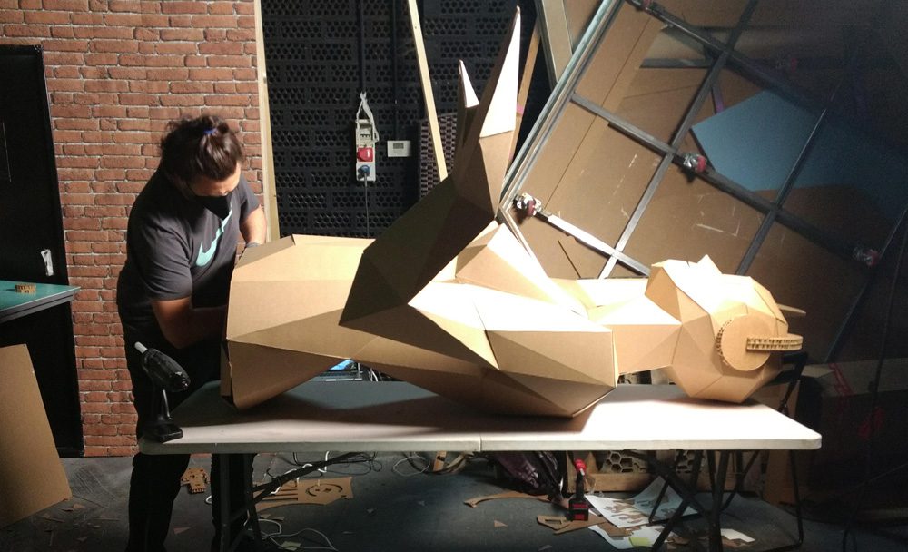 El proceso termina en el plató, con la figura montada, iluminada y lista para el espectáculo. Los ritmos de trabajo de un programa de televisión suelen ser muy exigentes, pero trabajando en equipo con un material tan versátil como el cartón los plazos se cumplen.