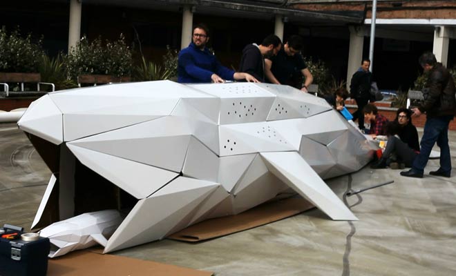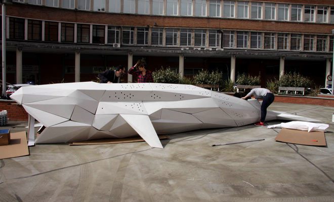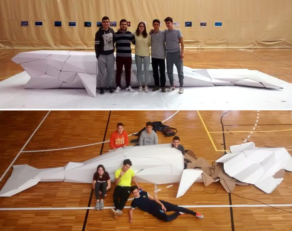 Para el diseño y fabricación de la ballena se utilizaron más de 150 piezas de cartón, todas distintas, unidas entre sí mediante abrazaderas plásticas. El montaje se llevó a cabo de forma participativa en el propio lugar, y fue realizado en 2 horas. El peso total de la instalación fue de unos 60kg.