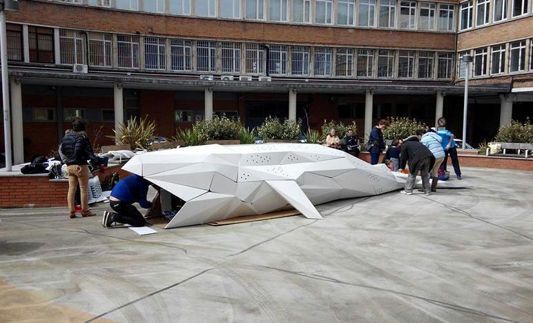 Nuestra propuesta “MOBY DICK”, tuvo lugar desde de las 11:00h de la mañana en la Plaza del Mercado de Otxarkoaga y consistió en una instalación efímera con forma de ballena, de 9m de largo y producida 100% en cartón.