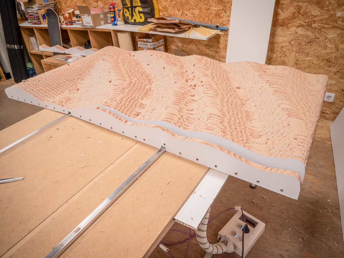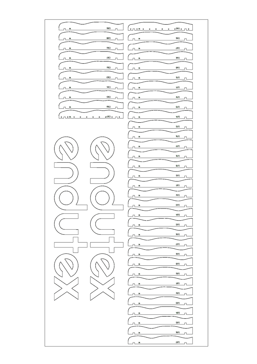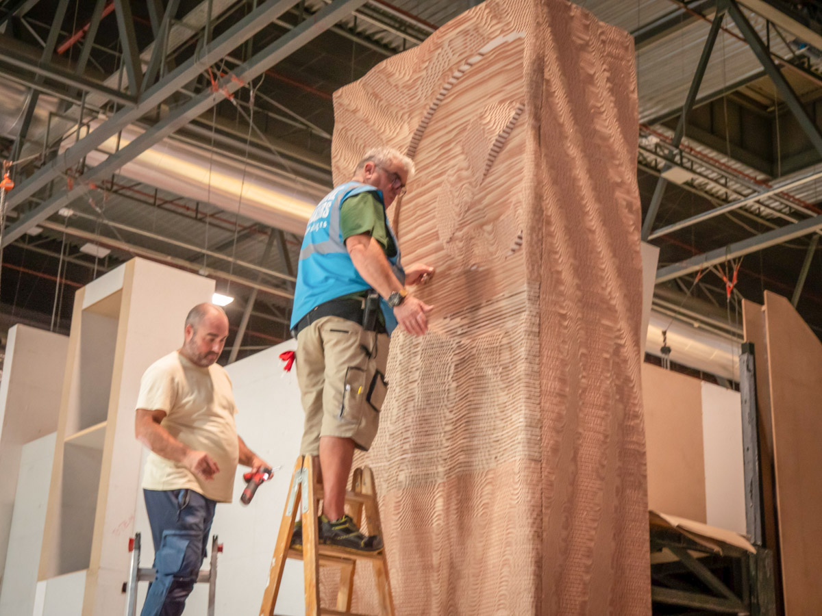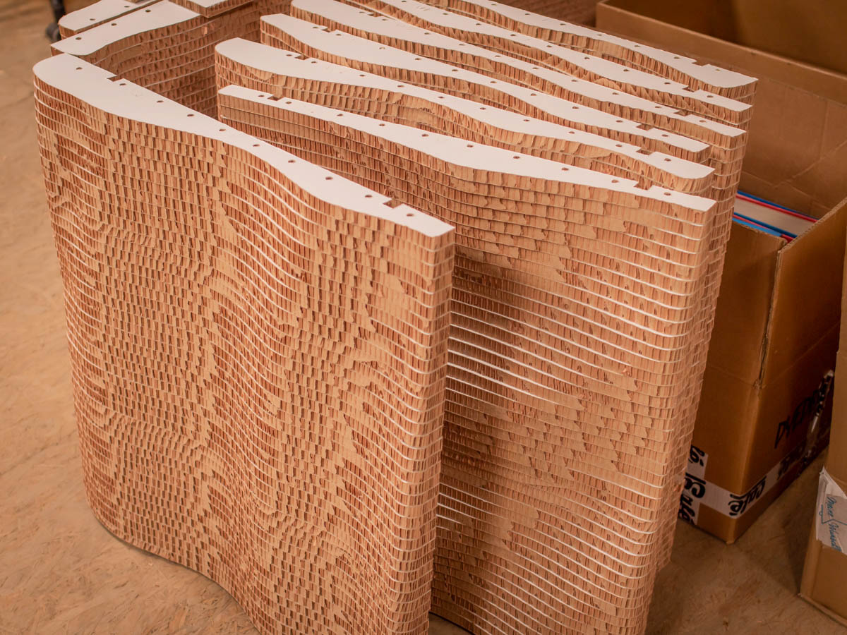 La pre producción de los muros paramétricos que revestían las esquinas fue fundamental. En total se crearon 2456 piezas. Cada una tenía su nombre y posición concreta. Unidas formaban 307 capas por cada esquina, encoladas por módulos y aseguradas con un sistema de encaje. Cada uno de los módulos era de 44 piezas. Eso nos obligó a ser muy precisos y a pensar al milímetro la gestión de taller. Como resultado: un montaje limpio, rápido y sin apenas complicaciones