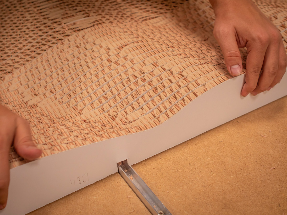 Varias décadas después de su creación, el Re-board es uno de los materiales más apreciados en el sector del diseño sostenible y la arquitectura efímera. Desde Endutex apuestan fuerte por este tipo de cartón dada su gran resistencia, la versatilidad que ofrece y el magnífico acabado que se consigue al trabajar con él. De hecho, a la hora de diseñar el muro paramétrico para el stand, fue fundamental para nosotros el atractivo estético de sus cantos, que dejan la estructura a la vista.