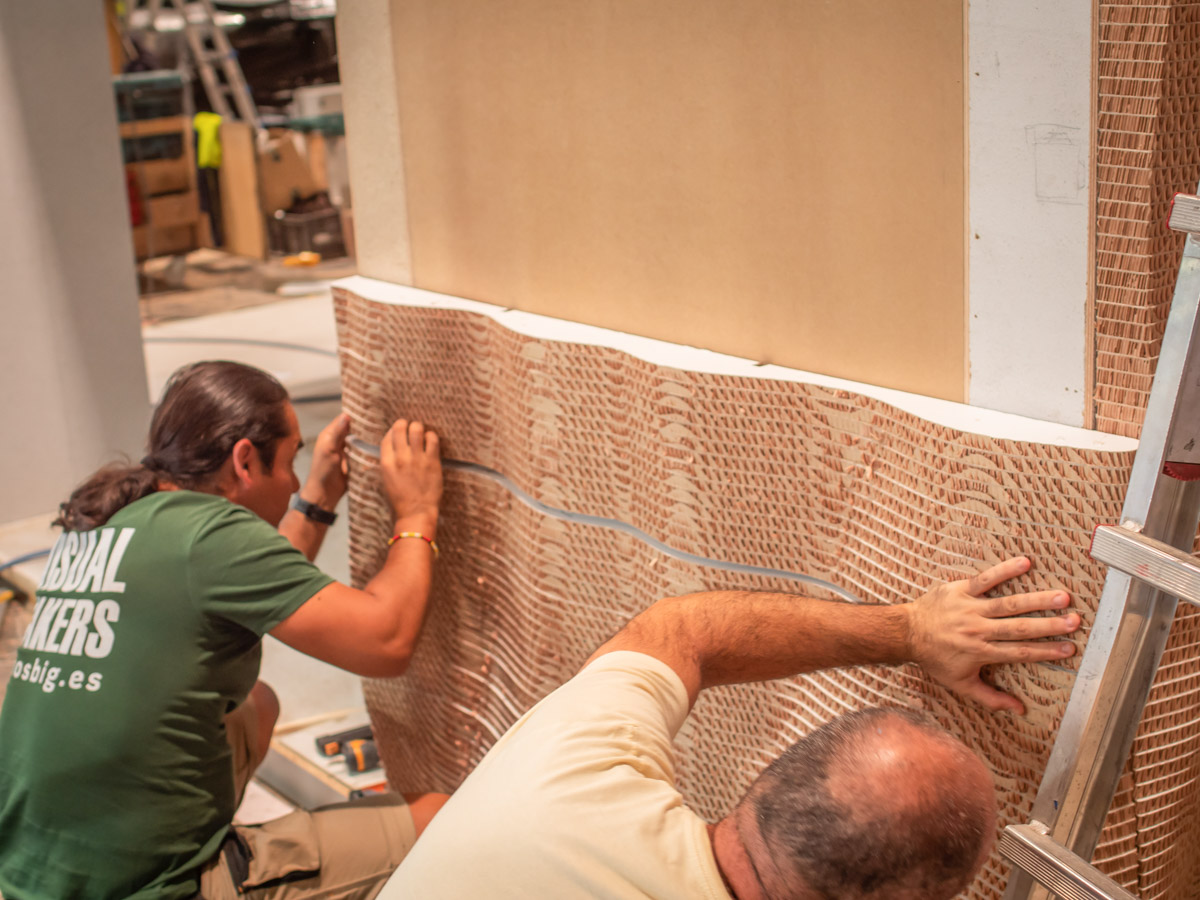 Este enfoque verde se refuerza con el muro paramétrico de cartón para el que han usado uno de sus materiales de cabecera: el Re-board. Ahí es donde entramos nosotros, en el diseño de todo el perímetro exterior del stand.