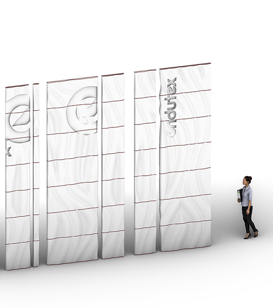 En el stand de Endutex optamos por un diseño en el que jugamos con la inclinación de unos 15º de la estructura interna. Al combinar varias capas y observarlas con cierta distancia, se generan unas ondas muy interesantes similares a las de la gráfica corporativa empleada en el proyecto como a elementos naturales como el agua o la madera.