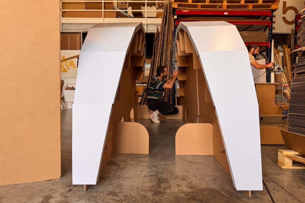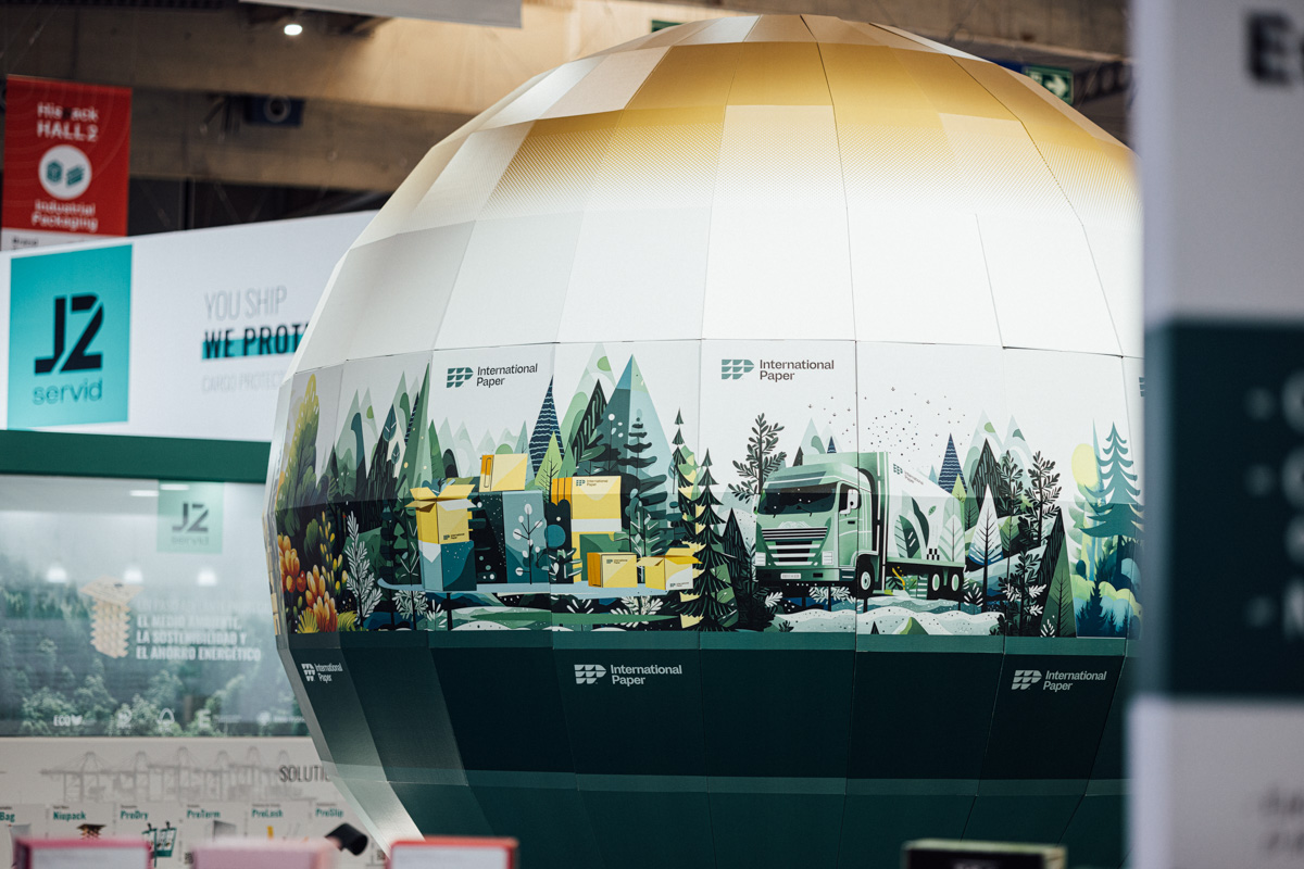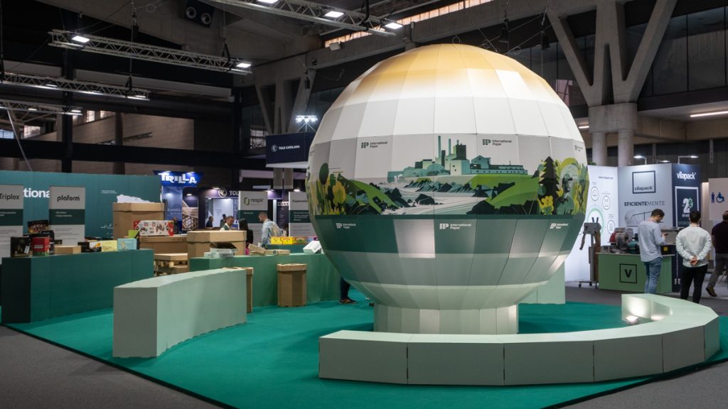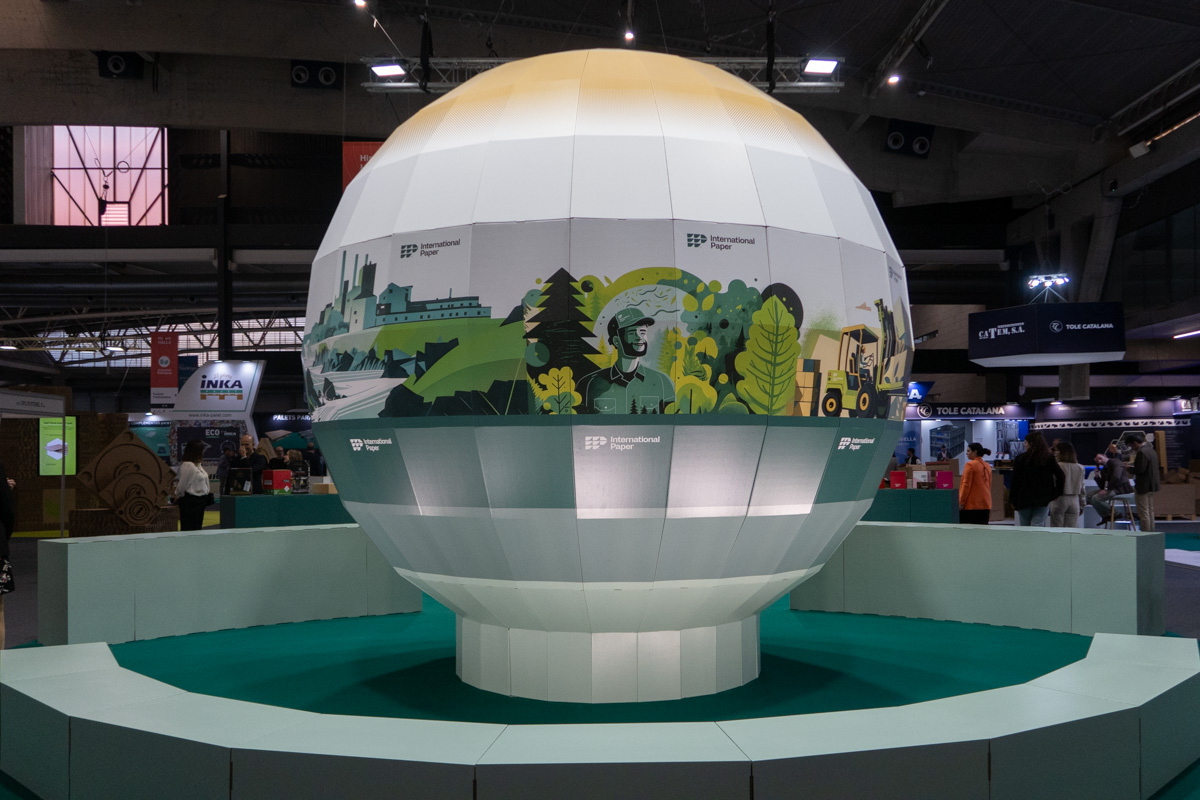 Para International Paper es habitual plantear stands en los que todo gire en torno a un gran objeto como reclamo y photocall. En esta ocasión fue una esfera gigante, de 4 m de diámetro. Al igual que el resto del stand, se construyó con el material que fabrica el cliente. En este caso, cartón ondulado tríplex para la estructura y EB blanco para los acabados, con gráfica corporativa impresa en algunas zonas.