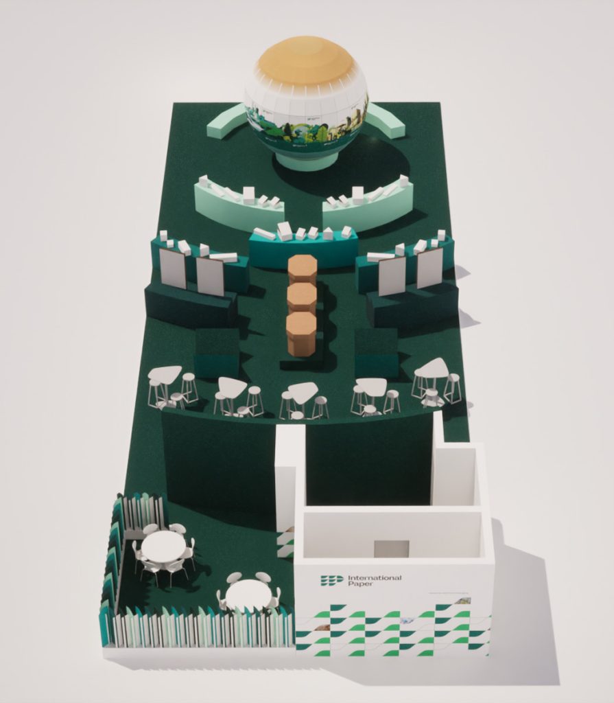 International Paper es una de las marcas de referencia a nivel mundial en el sector del packaging sostenible y la fabricación de papel y cartón. Suelen aprovechar su presencia en ferias y eventos profesionales para reforzar su identidad corporativa a través de diseños impactantes que muestran la capacidad de sus materiales. Para su participación en la feria Hispack de Barcelona nos pidieron diseñar un espacio que integrara exposición de productos, zona de reunión, barra de bar, mostrador de atención al público y, como siempre, un elemento central llamativo que atrajera al visitante. El resultado fue un enorme planeta de cartón en torno al cual se distribuyeron todas las zonas del stand.