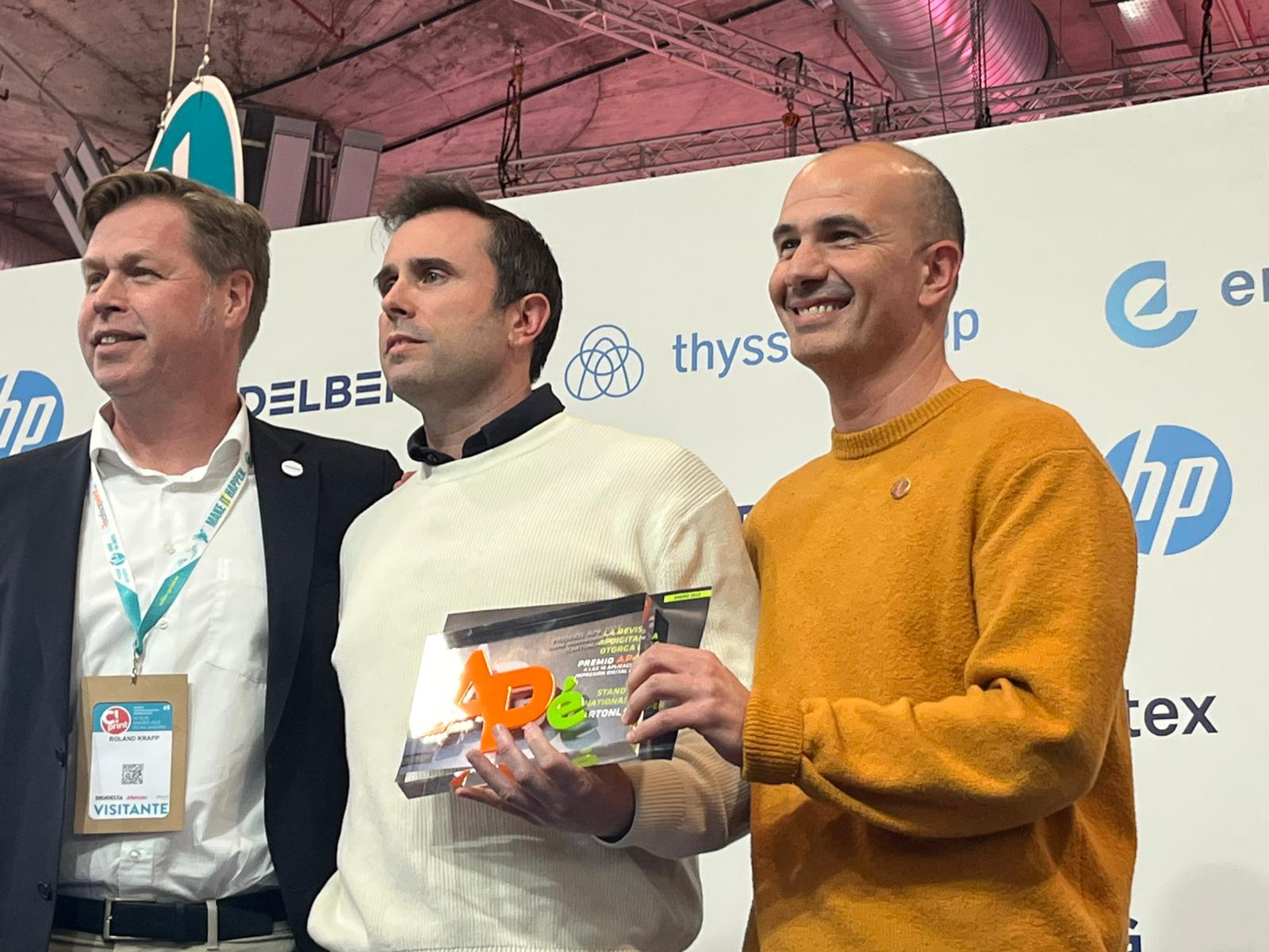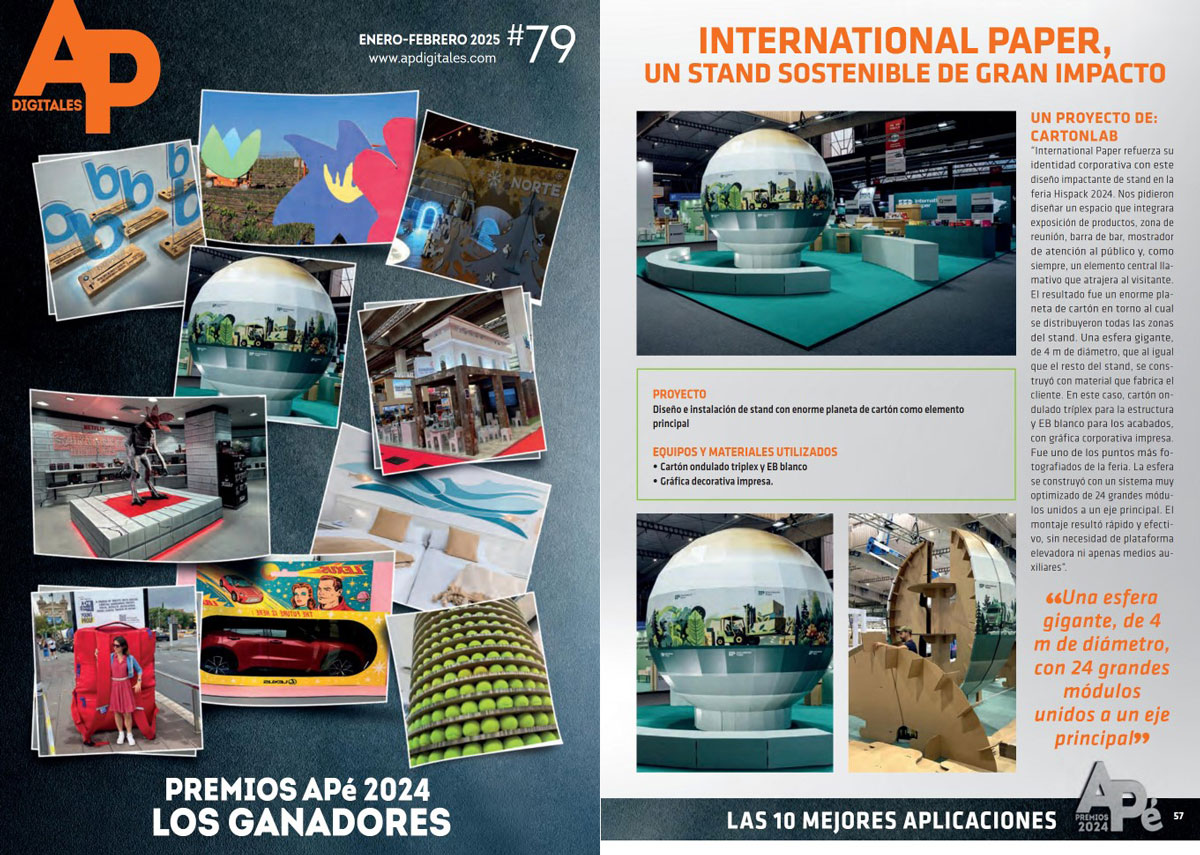 Cada año, durante el salón C!Print Madrid, la revista AP Digitales entrega sus premios a las mejores aplicaciones gráficas profesionales de nuestro país. Uno de los galardonados fue este stand para International Paper, reconocido por la calidad y creatividad de sus acabados. Para recogerlo acudieron los responsables y fundadores de Cartonlab, Nacho Bautista y Pablo García.