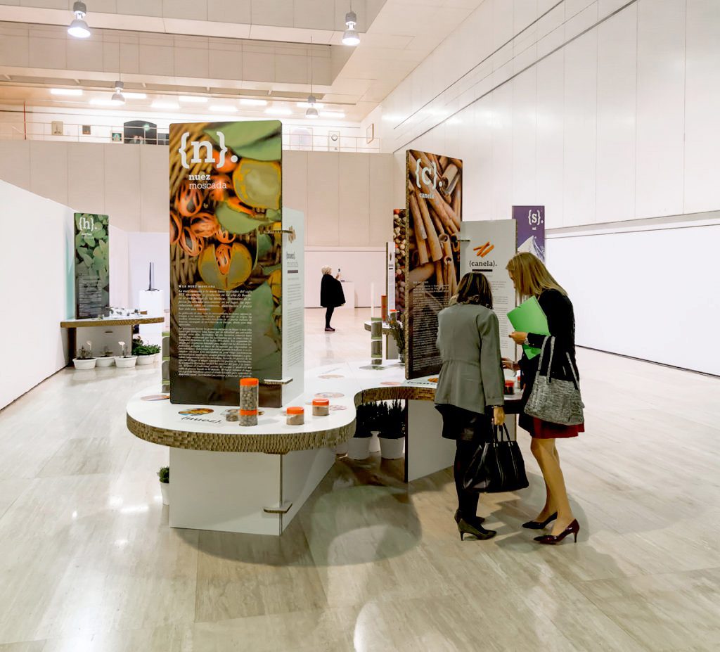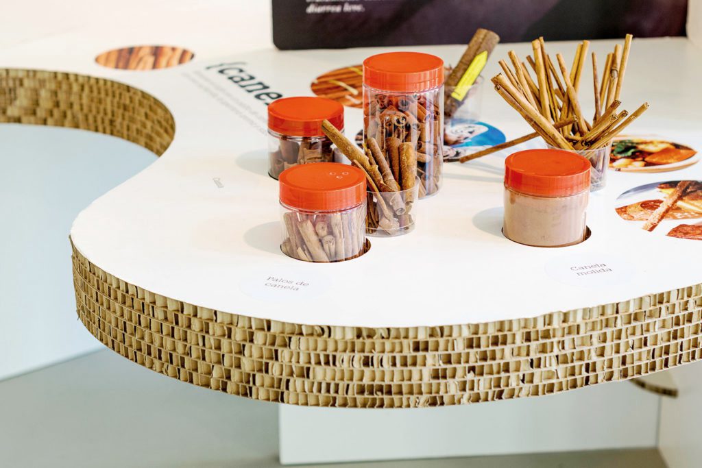 Los paneles expositores componían un recorrido a través de la historia, la geografía y el valor de cada una de las especias. Estaban personalizados con impresión digital, que aportaba un resultado muy colorista y repleto de contenido. Para personalizar los taburetes que mencionábamos antes también se usó la misma técnica. El diseño en cartón a medida optimiza mucho el proceso de producción de exposiciones.