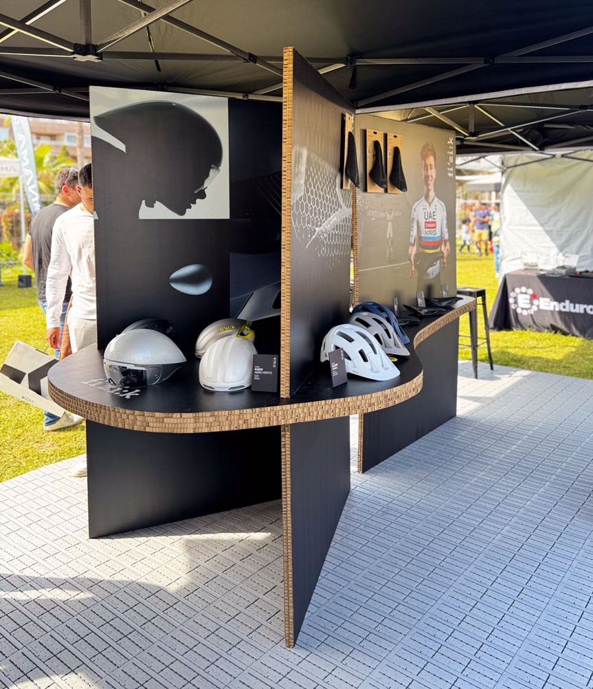 Este concepto de mesa expositora funcional y reutilizable lo hemos aplicado en otros proyectos reinterpretado, pero sin perder solidez ni capacidad expositiva. Un buen ejemplo es la que diseñamos para la empresa de material ciclista Teambike. Mesa de líneas curvas encajada con amplios paneles personalizados con gráfica impresa, estantes y sistemas de cuelgue para productos.