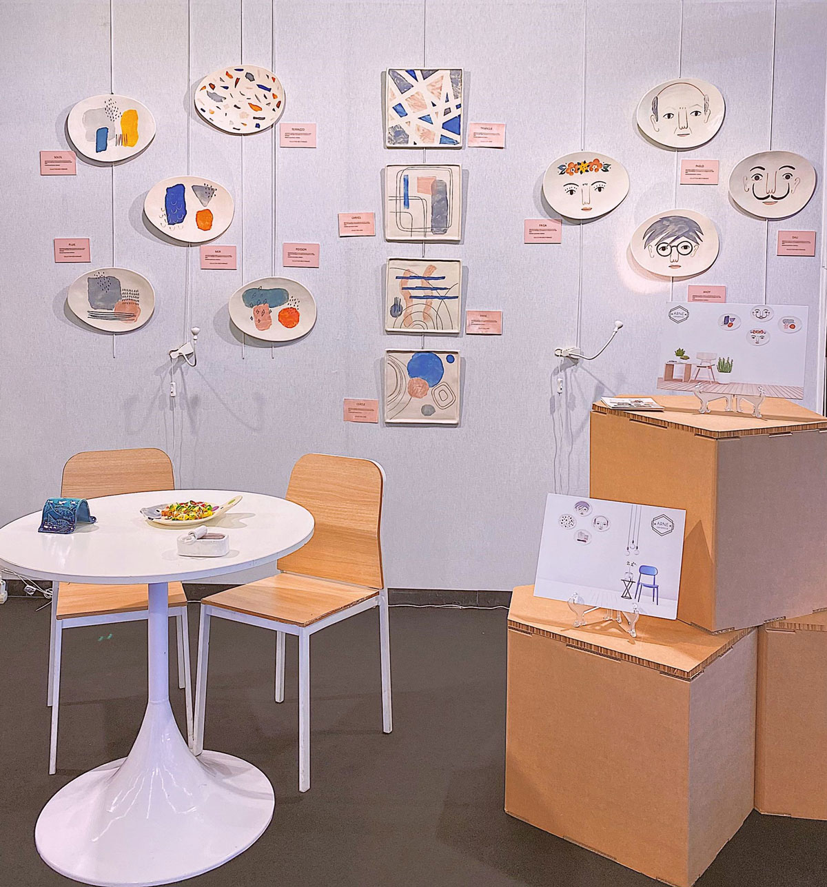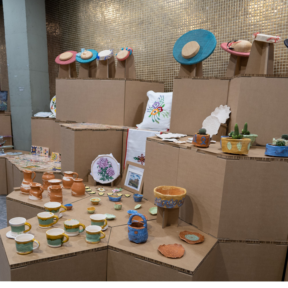 En el caso de que haya que transportar piezas artesanales fuera del centro, para cualquier tipo de evento o exposición, los módulos pueden emplearse como embalaje. El grosor del material (un resistente cartón alveolar Buigiordano) y su volumen permiten guardar las piezas en el interior para transportarlas y luego colocarlas sobre la superficie exterior para exponerlas. De hecho, los módulos han viajado a ferias internacionales como Maison & Objet, en París, para exponer y promocionar la artesanía murciana.