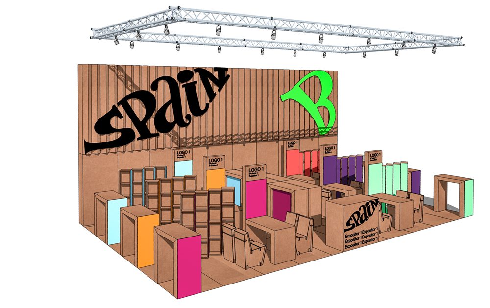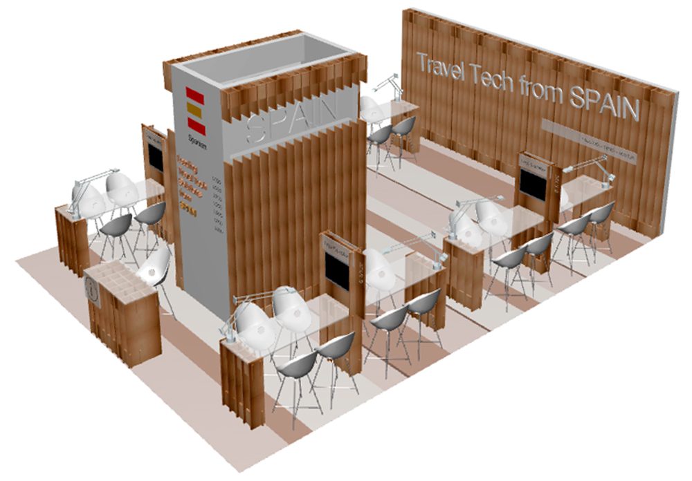 El proyecto tenía una configuración muy sencilla y funcional en la que cada uno de los 9 expositores disponía de un espacio de exposición y zona de reuniones propia compuesta de estantería expositor, almacenaje, mesa y sillas. La zona común de atención al público incluía un gran mostrador, portafolletos y un gran espacio de almacén. Todos los elementos del stand fueron personalizados con los colores y logotipos de la marca España, incluída la moqueta.