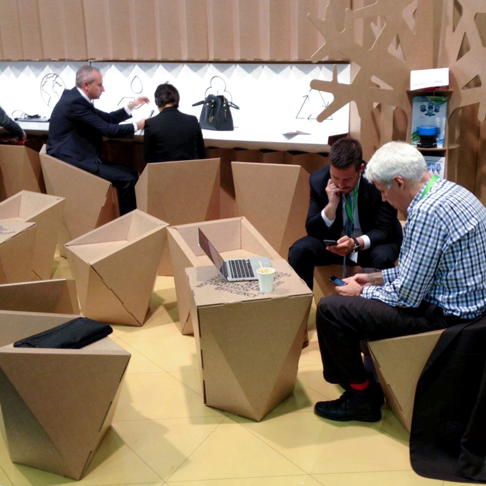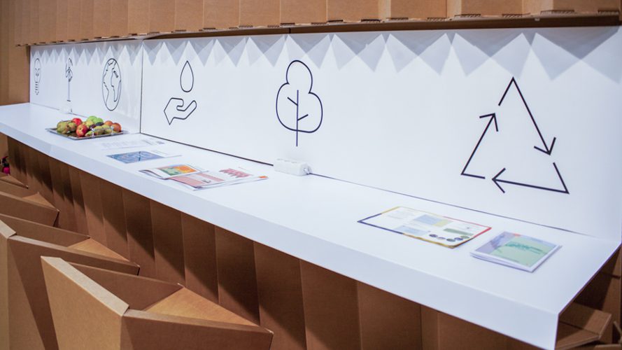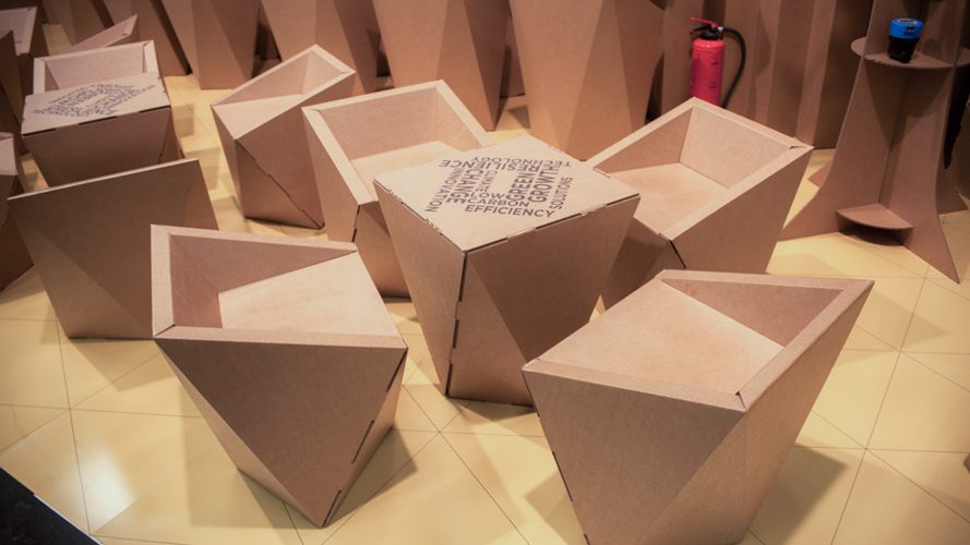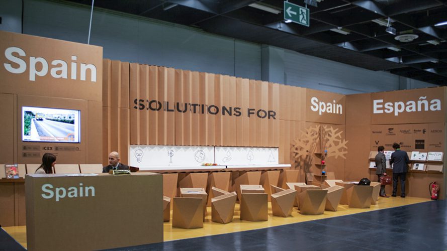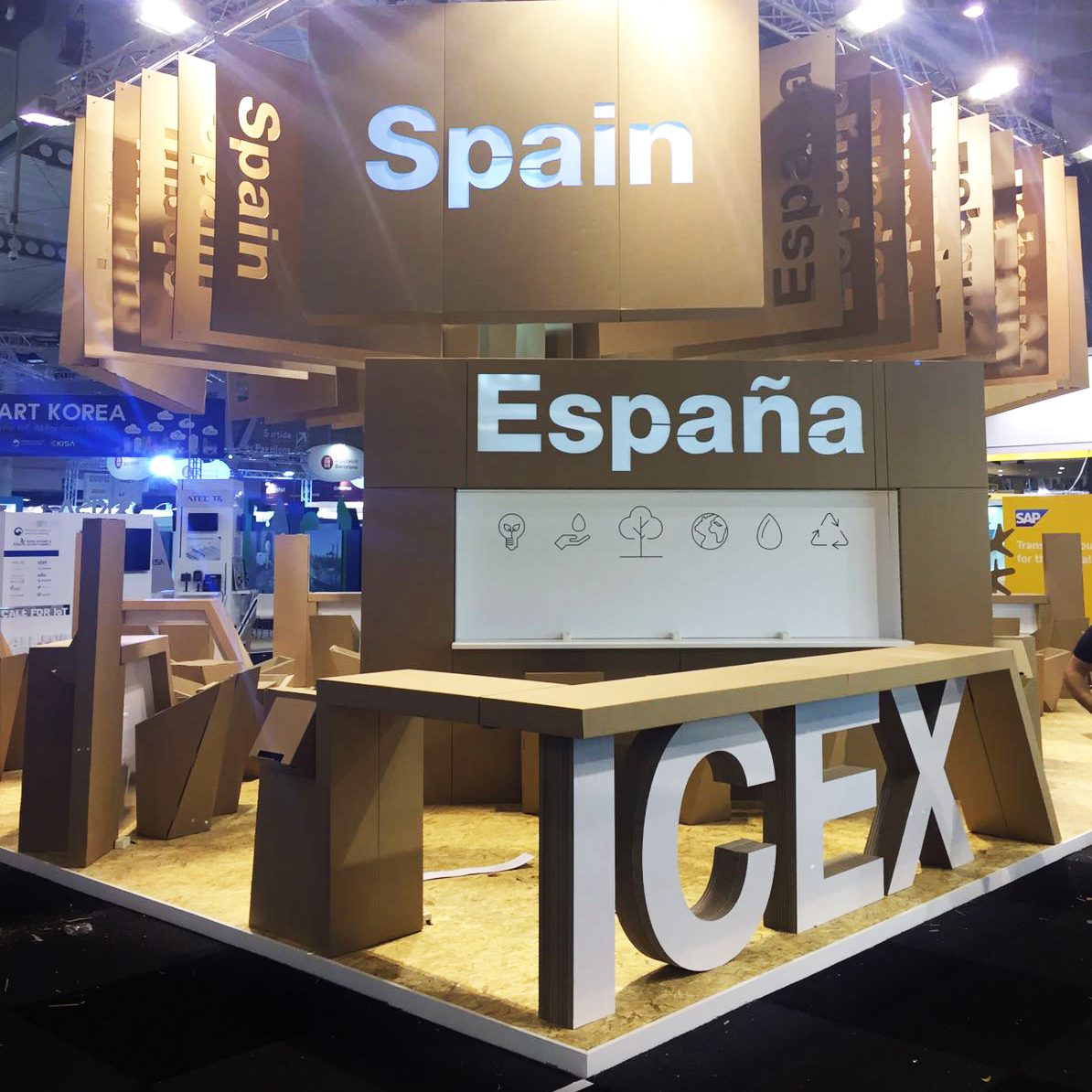 Carbon Expo es un punto de encuentro entre representantes del sector privado y de proyectos relacionados con la prevención del cambio climático. Para la edición de 2016 apostamos por un espacio de 30m2 diseñado y producido íntegramente en cartón. Combinaba gráfica troquelada e impresa promocionando la marca España. Estaba compuesto por varios paneles plisados traseros y diferentes elementos de mobiliario. Dependiendo del punto de observación de los visitantes, leían una parte del eslogan: ‘Solutions for’ o ‘Climate Change’.