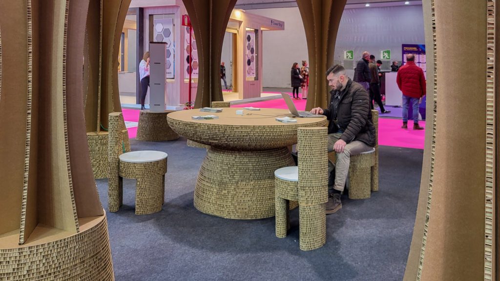 El stand cuenta con una estructura formada por columnas modulares de cartón nido de abeja, acompañadas de iluminación integrada. Este diseño combina funcionalidad y estética arquitectónica, reflejando tanto las propiedades del material como el compromiso sostenible de Panelpac. En medio de la feria, este espacio se convierte en un refugio visual y práctico, mostrando cómo el cartón puede transformar los entornos expositivos.