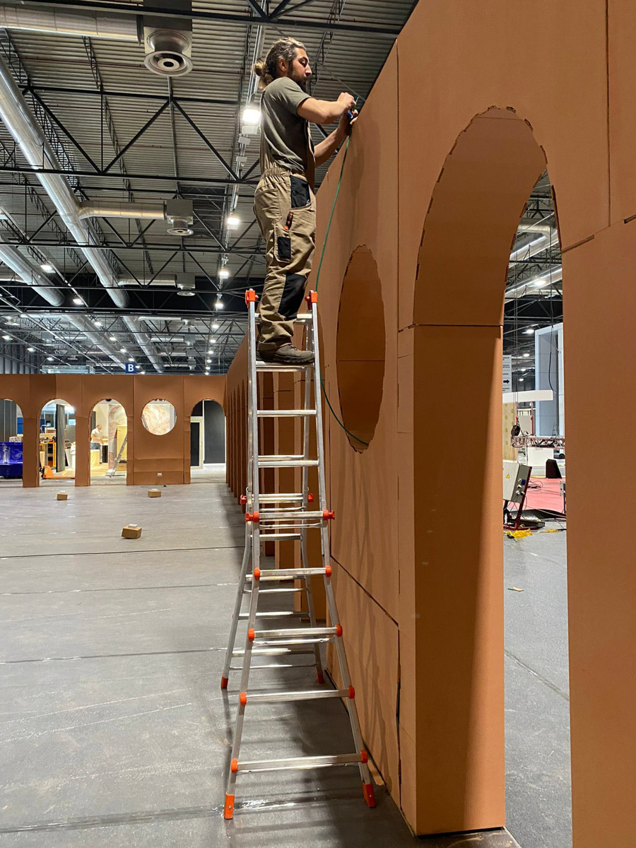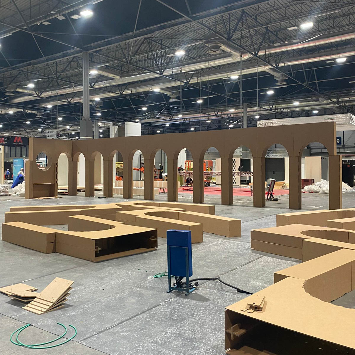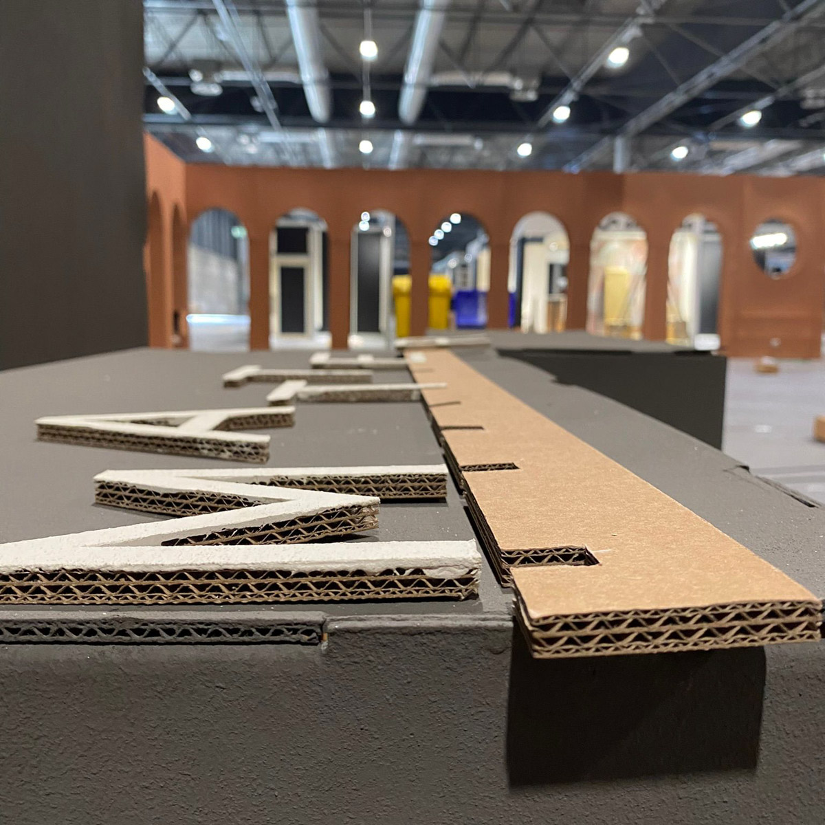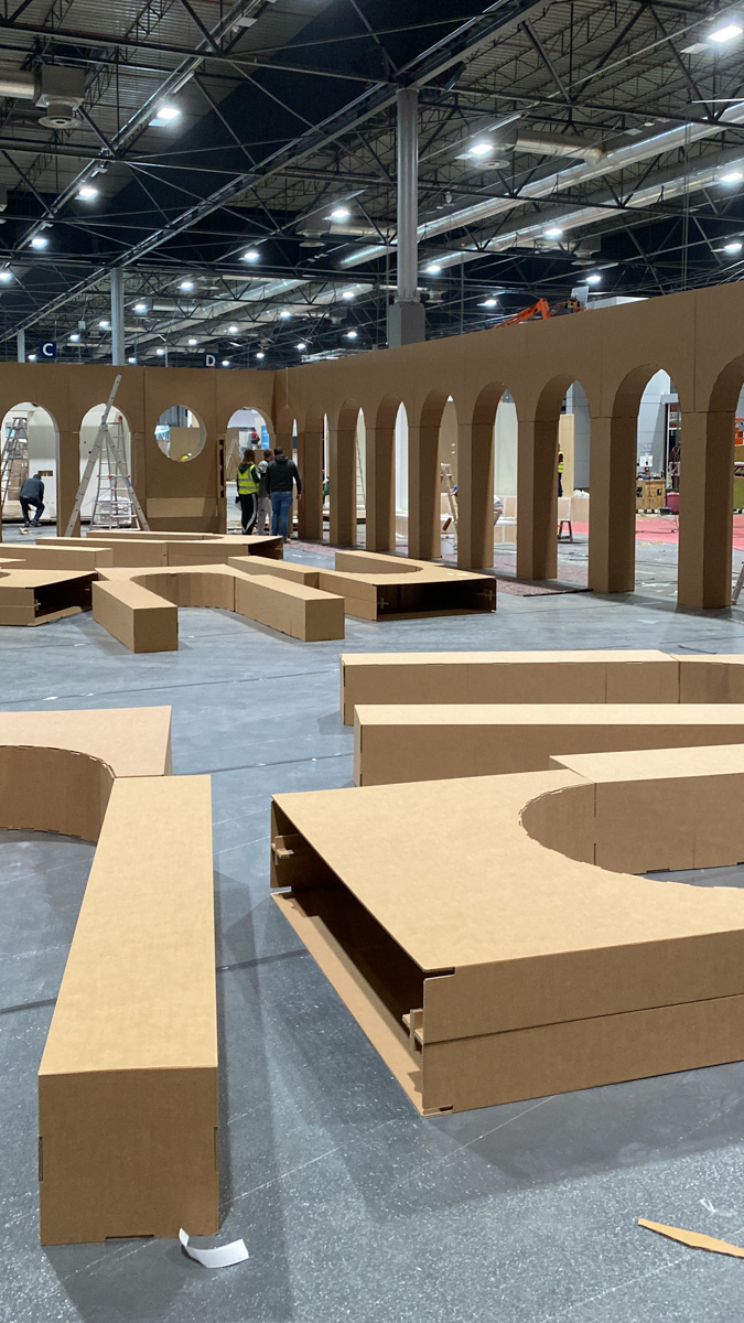 Uno de los aspectos más llamativos del stand diseñado para Matter fue su estructura de arcos de medio punto a modo de pórtico. Se trata de un recurso de gran impacto visual, que además cumplió con la función de proporcionar un acceso muy fluido a la zona de exhibición. Una vez en el interior la experiencia era envolvente y memorable para los visitantes. Hay que tener en cuenta que era un stand muy grande, con 310 m2 de superficie en los que se realizaron diversas actividades con gran afluencia de público. El uso del cartón para construir ese pórtico perimetral que rodea el stand supuso todo un reto estructural.