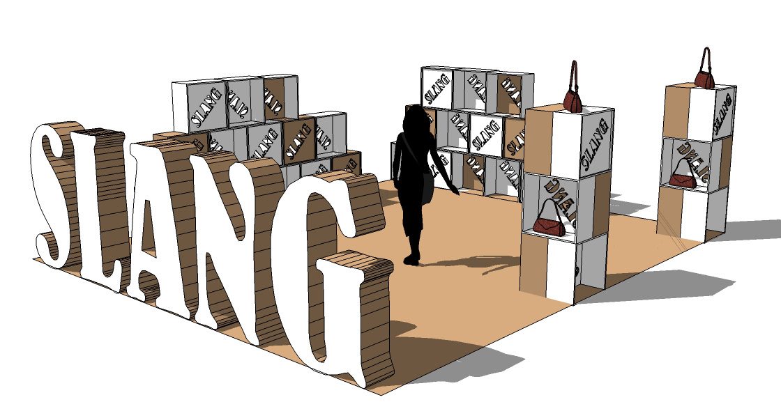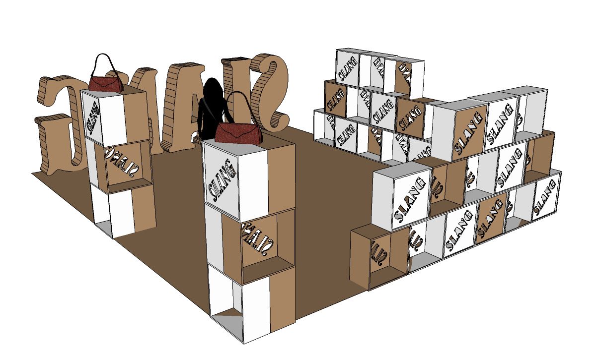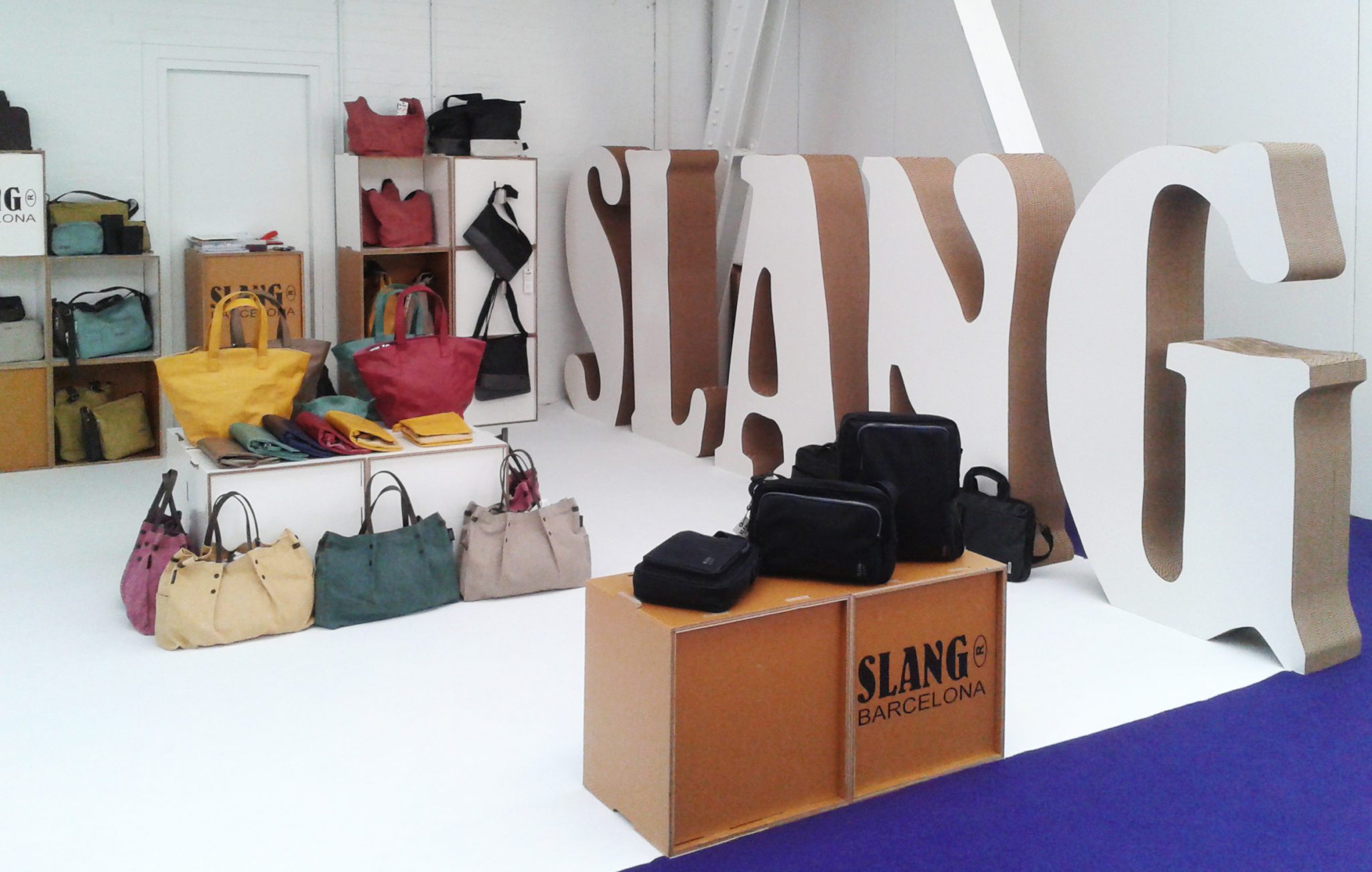 SLANG la marca barcelonesa de bolsos y complementos participa estos días en la ferias Purelondon y Mipel (Londres y Milan) con stands en cartón producidos por cartonlab.