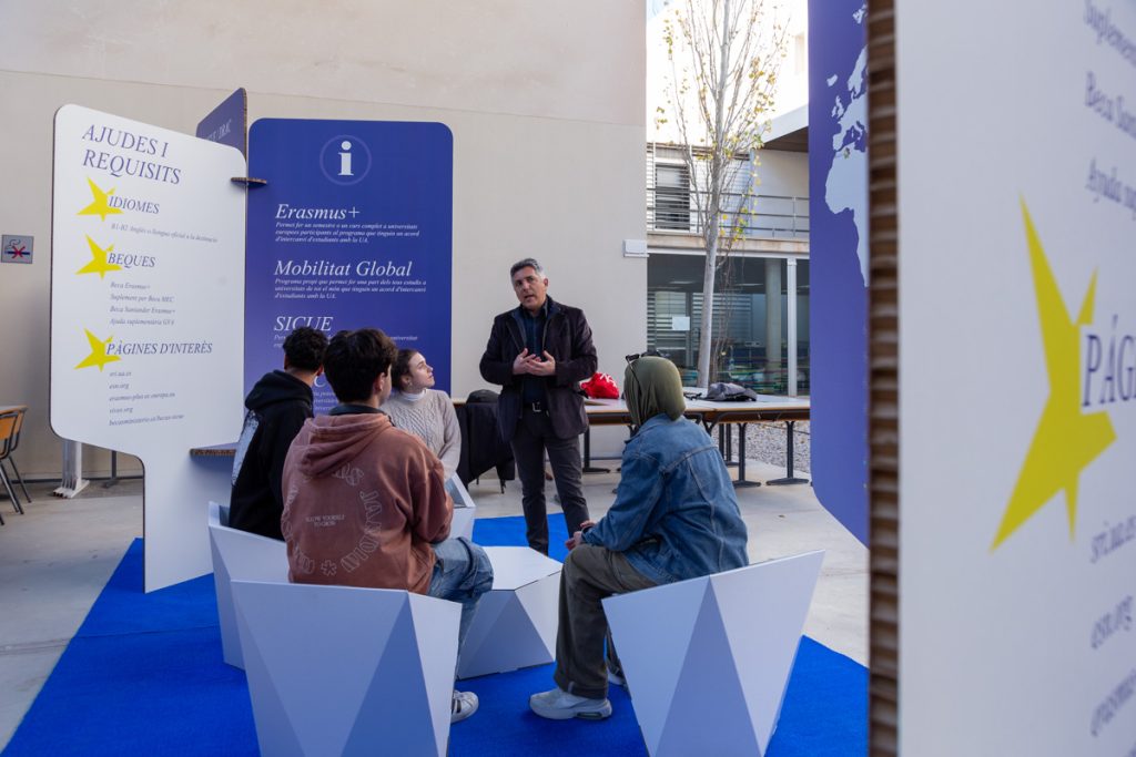 La Oficina de Movilidad de la Universidad de Alicante suele hacer eventos informativos en los que expone datos e imágenes sobre la experiencia del alumnado que viaja al extranjero como parte de su formación académica. Necesitaban un recurso muy práctico y fácil de montar, pero que a la vez ofreciera una gran superficie expositiva en la que contar cosas. La solución fueron paneles con forma de pétalos encajables entre sí y personalizables con impresión digital. Para diseñarlos nos inspiramos directamente en los de Firarq, aplicando algunas mejoras funcionales y estéticas.