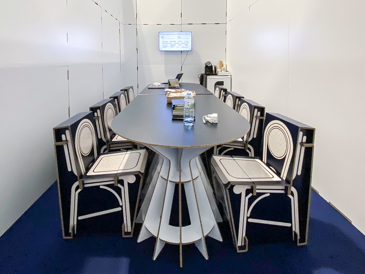 Para esta edición de Network X apostamos por un concepto basado en lamas de cartón encajadas, creando una trasera imponente de 4 metros de altura con luminarias verticales. Incorporamos pantallas y peanas funcionales en las traseras, optimizando el espacio para consultas digitales. El mobiliario, desde sillas, hasta bancos, mesas auxiliares o el mostrador de atención al público, seguía el mismo sistema encajable de lamas. La distribución en L de las traseras del stand delimitaba el espacio y generaba un entorno acogedor y profesional en combinación con el mobiliario.