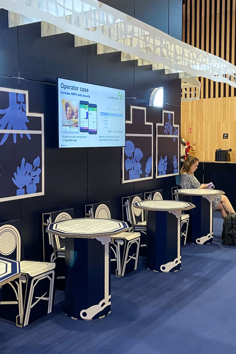 El primer stand que diseñamos para Network X recreaba el ambiente de una cafetería parisina clásica. Para ello, diseñamos una estructura de traseras modulares con ventanas y motivos vegetales impresos, luminarias y pantallas incorporadas. Todo a juego con los toldos y el mobiliario personalizado. En la terraza, instalamos mesas y sillas modelo Jara con impresión digital, evocando el estilo brasserie de París. En el interior, una amplia mesa de reuniones Brasilia y más sillas personalizadas ofrecían un espacio exclusivo para encuentros de negocios. La combinación de materiales sostenibles y diseño temático resultó en un stand atractivo, funcional y alineado con la identidad de la marca.