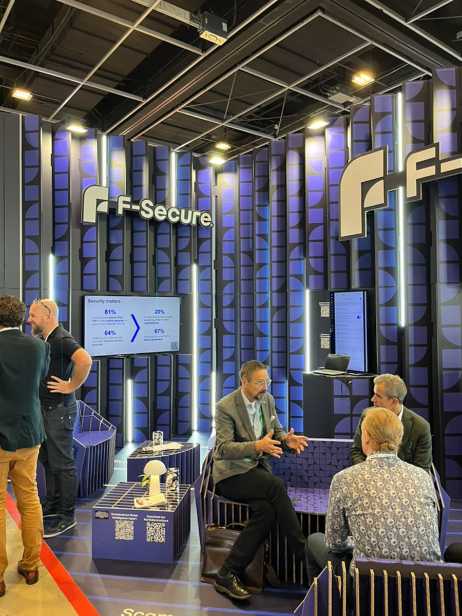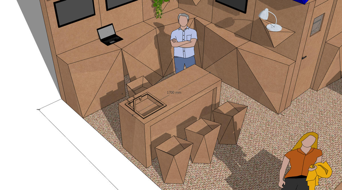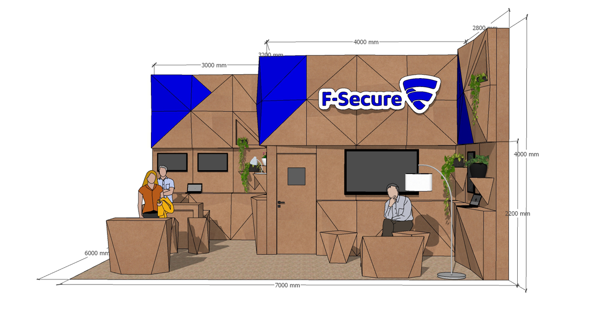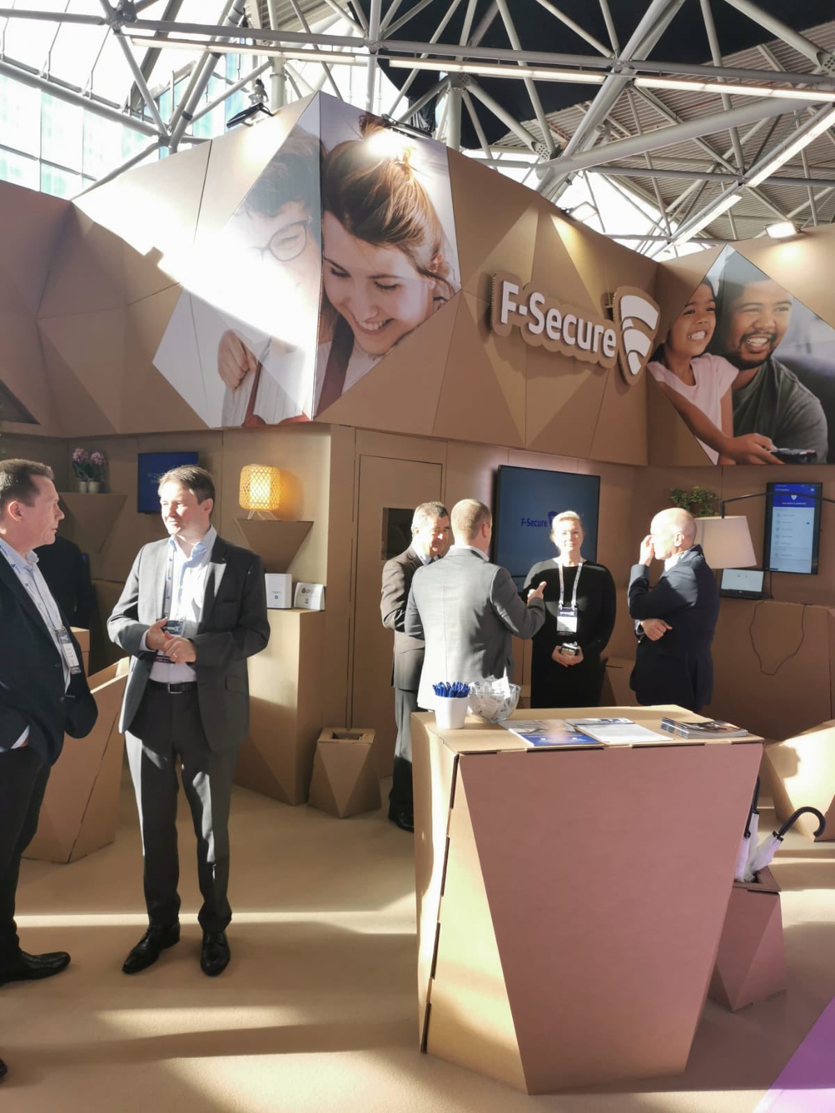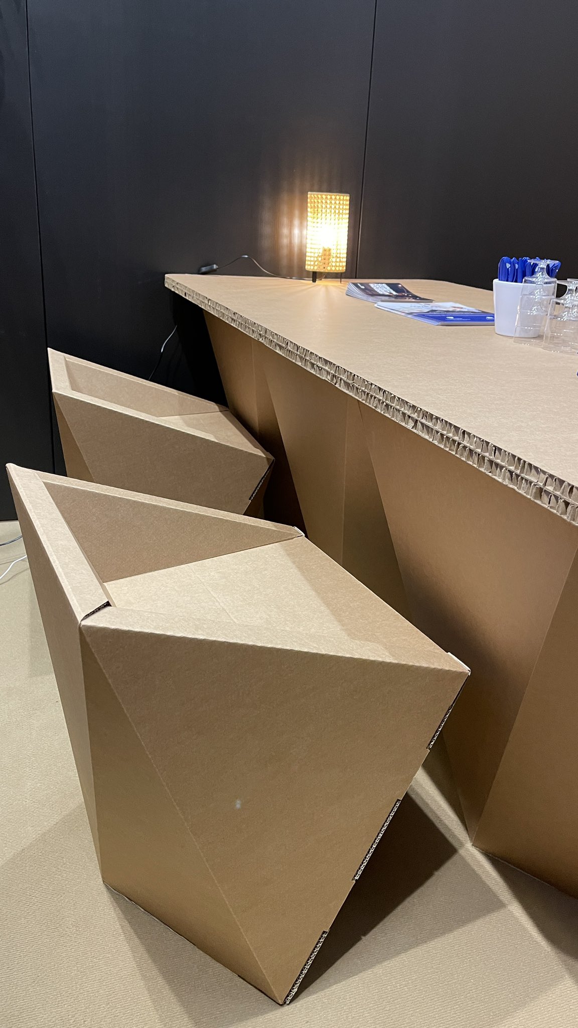 Para el evento World Forum en Ámsterdam diseñamos un stand acogedor y versátil con tres áreas diferenciadas. Un mostrador facetado facilitaba la atención directa al público, mientras que un segundo punto de encuentro ofrecía un ambiente más relajado con taburetes y mesa de despacho en U. Además, incorporamos un tercer espacio con sillas faceta y una mesa baja hexagonal, pensado para reuniones informales. La estética facetada se extendía a las traseras y soportes para plantas, integrando diseño y funcionalidad. Todo el mobiliario fue fabricado en cartón con acabado kraft e impresiones corporativas, asegurando una solución sostenible sin perder impacto visual.