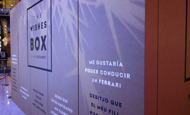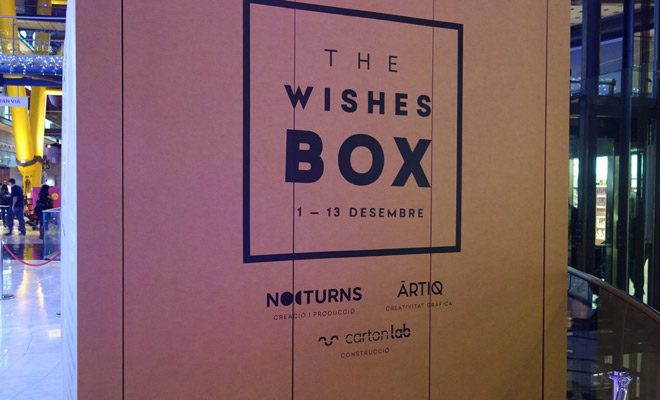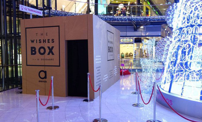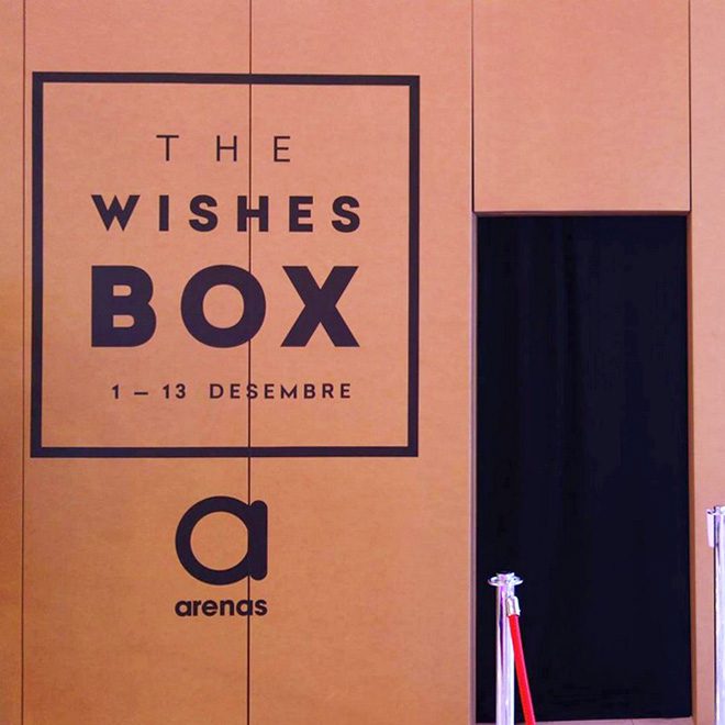 Del 1 al 13 de diciembre Arenas de Barcelona instala un misterioso pabellón de cartón en forma de caja de grandes dimensiones en la Plaza Central. Todas las personas que accedan a su interior tendrán la posibilidad de hacer realidad el deseo que pidan. Cualquiera de los clientes de Arenas que haga una compra por un valor determinado en el Centro Comercial tendrá la posibilidad de entrar e en la Wishes Box y hacer realidad sus sueños.
