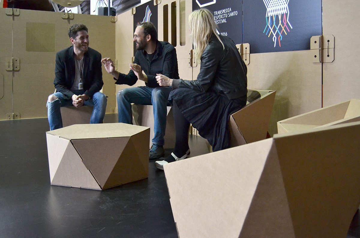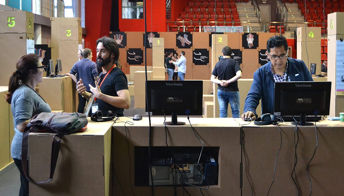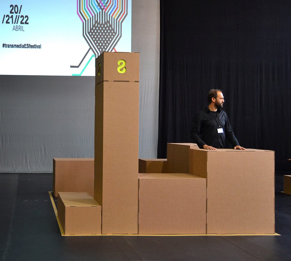 Los participantes del festival disfrutaron de stands modulares de 9m2, compuestos por formas rectangulares sencillas de tamaños variados encajadas entre sí. Esta forma de construcción aportó muchas posibilidades al el stand, en el que contaron con almacenaje, totems, mesas y estanterías. Un diseño innovador acorde con las últimas tendencias en tecnología y transmedia que ofrecía el festival.