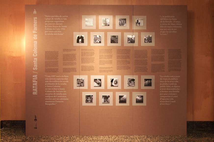 La exposición se pensó para dar a conocer la vinculación de la población con la ratafía, información sobre sus ingredientes, su elaboración, su color, su olor y todo el movimiento social y cultural que hay detrás de su fiesta anual. Todo ese contenido se muestra impreso sobre cartón en unas traseras modulares personalizadas que con el tiempo se han ido actualizando.