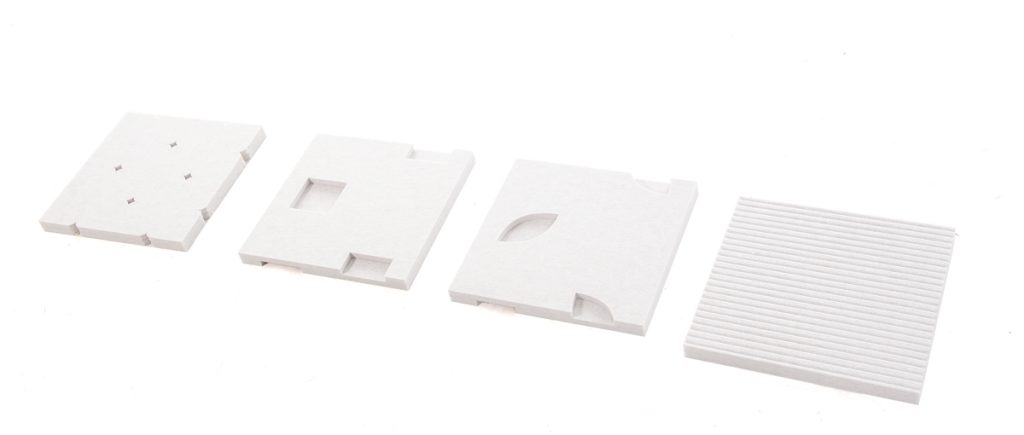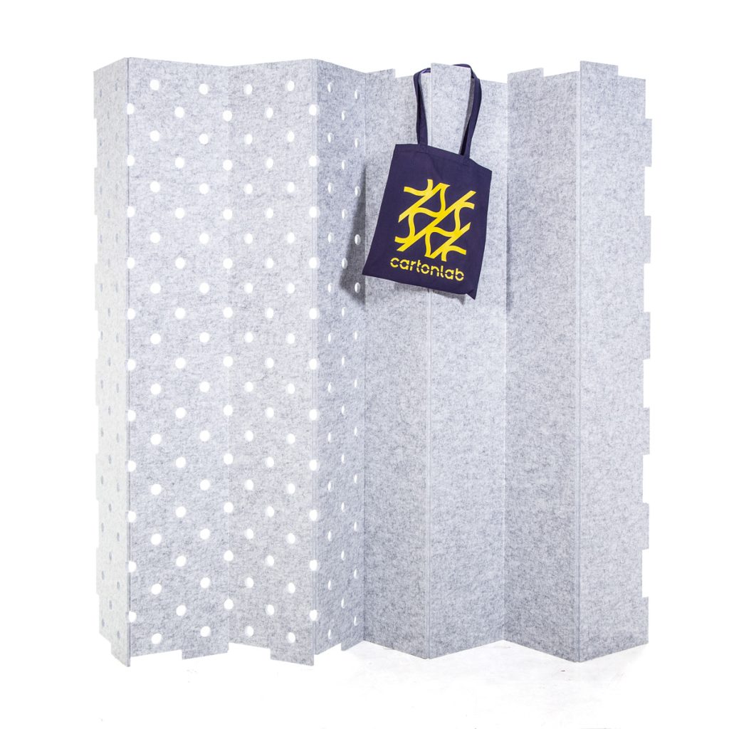 El concurso del CETEM consistía en poner en contacto a creativos con empresas que pudieran materializar sus diseños. Así es como desde Cartonlab conocimos a Borja Sepulcre y comenzamos a ejercer de asesores técnicos, creativos y de desarrollo. Se hicieron muestras de corte de varios tipos, experimentando con las posibilidades del material. Finalmente, se definieron dos modelos básicos de separador de espacios, uno liso y otro con motivos personalizados troquelados. Ambos plegables para mayor comodidad de uso.