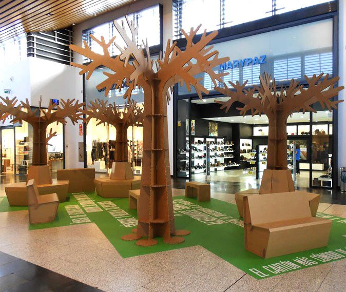 Ambientada en relajantes colores verdes y marrones inspirados en la naturaleza, el visitante es invitado a darse un respiro en esta nueva área con sugerentes mensajes impresos en el suelo: ‘A veces, acartonarse sienta bien’, ‘Siéntate y recicla tu descanso’, ‘Tus piernas te lo agradecerán, el medioambiente también’ o ‘El cartón más cómodo de Madrid’ Revista Centros Comerciales