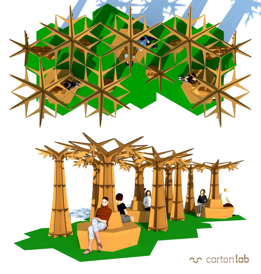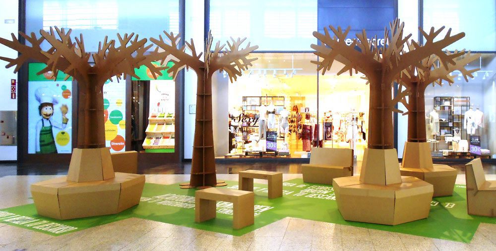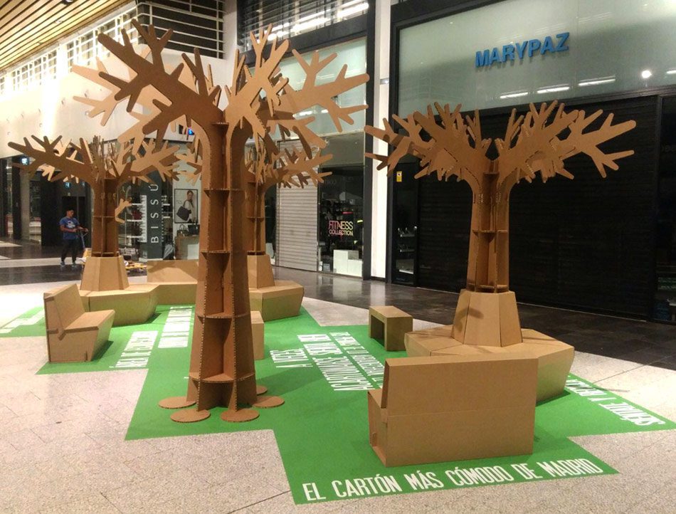 Esta zona de descanso pop up simula un pequeño bosque de cartón, formado por 5 árboles de cartón asociados a islas-mobiliario de descanso. A pesar de su ligereza y fácil montaje, este material versátil proporciona una gran resistencia estructural, llegando a soportar más de 120 kilos de peso, con sólo aplicar las técnicas de diseño estructural apropiadas. También se han incorporado cuatro bancos independientes de cartón, realizados en acabado Kraft.